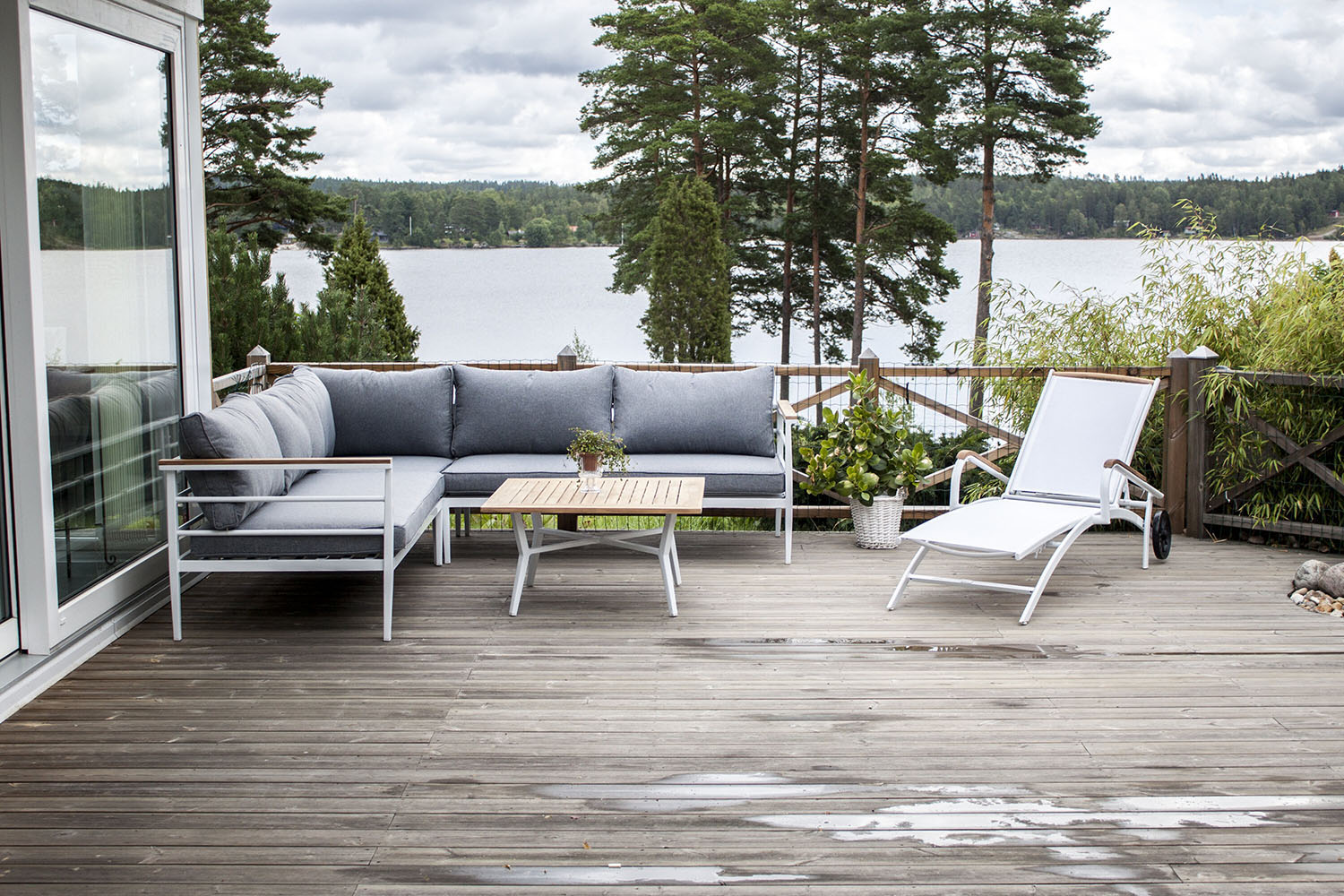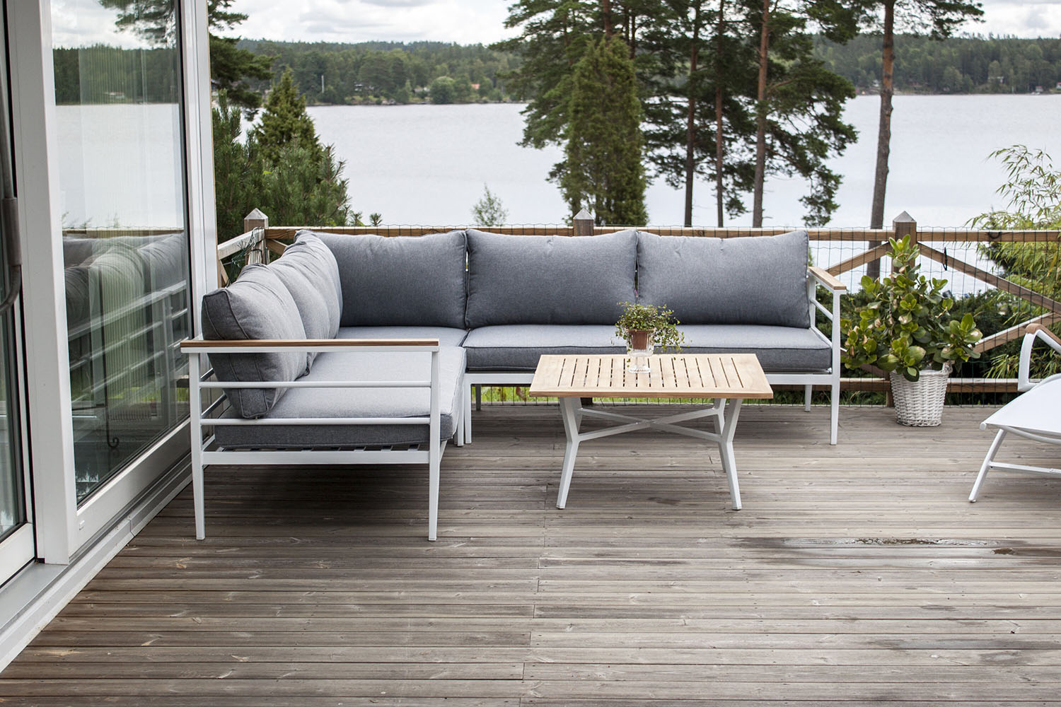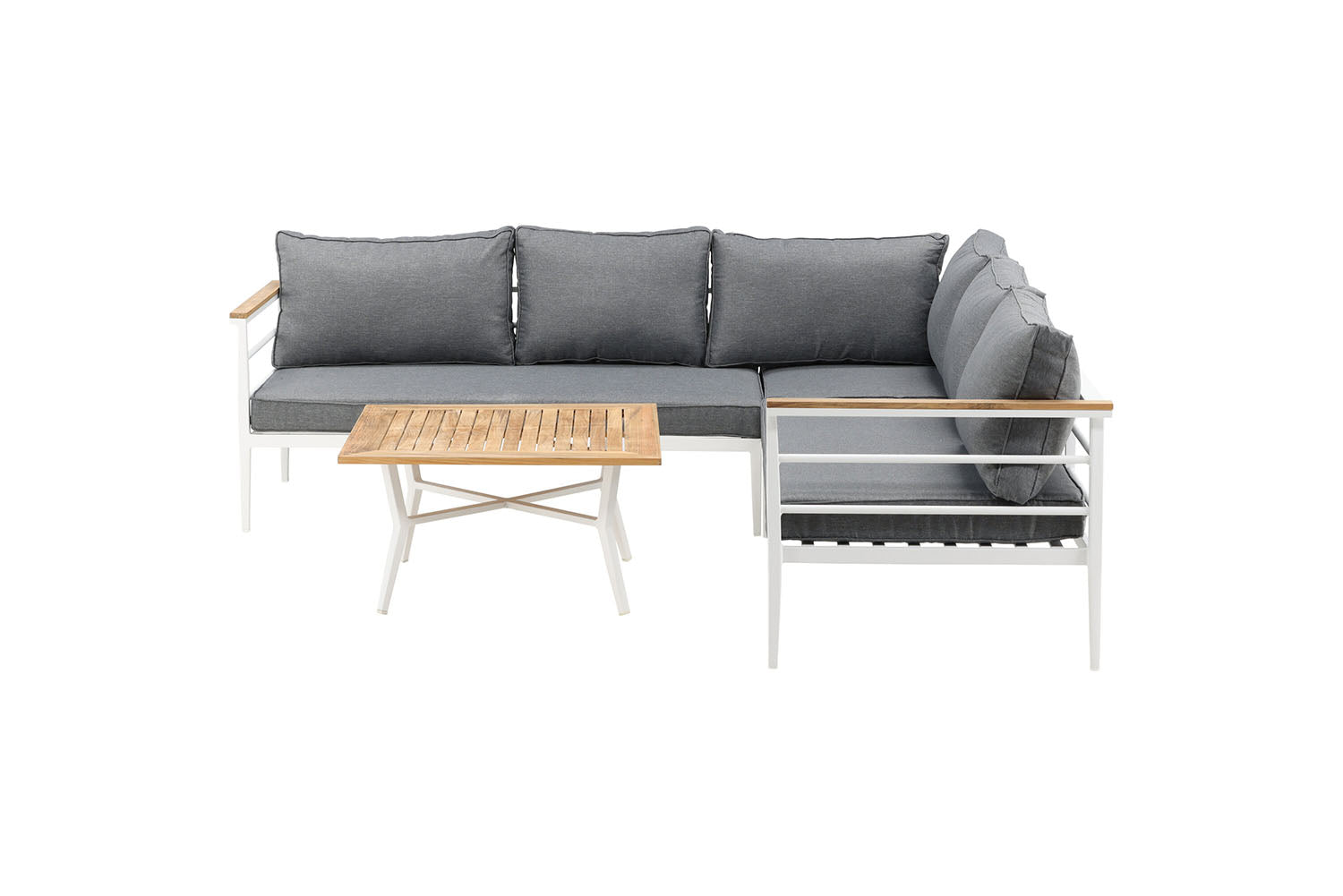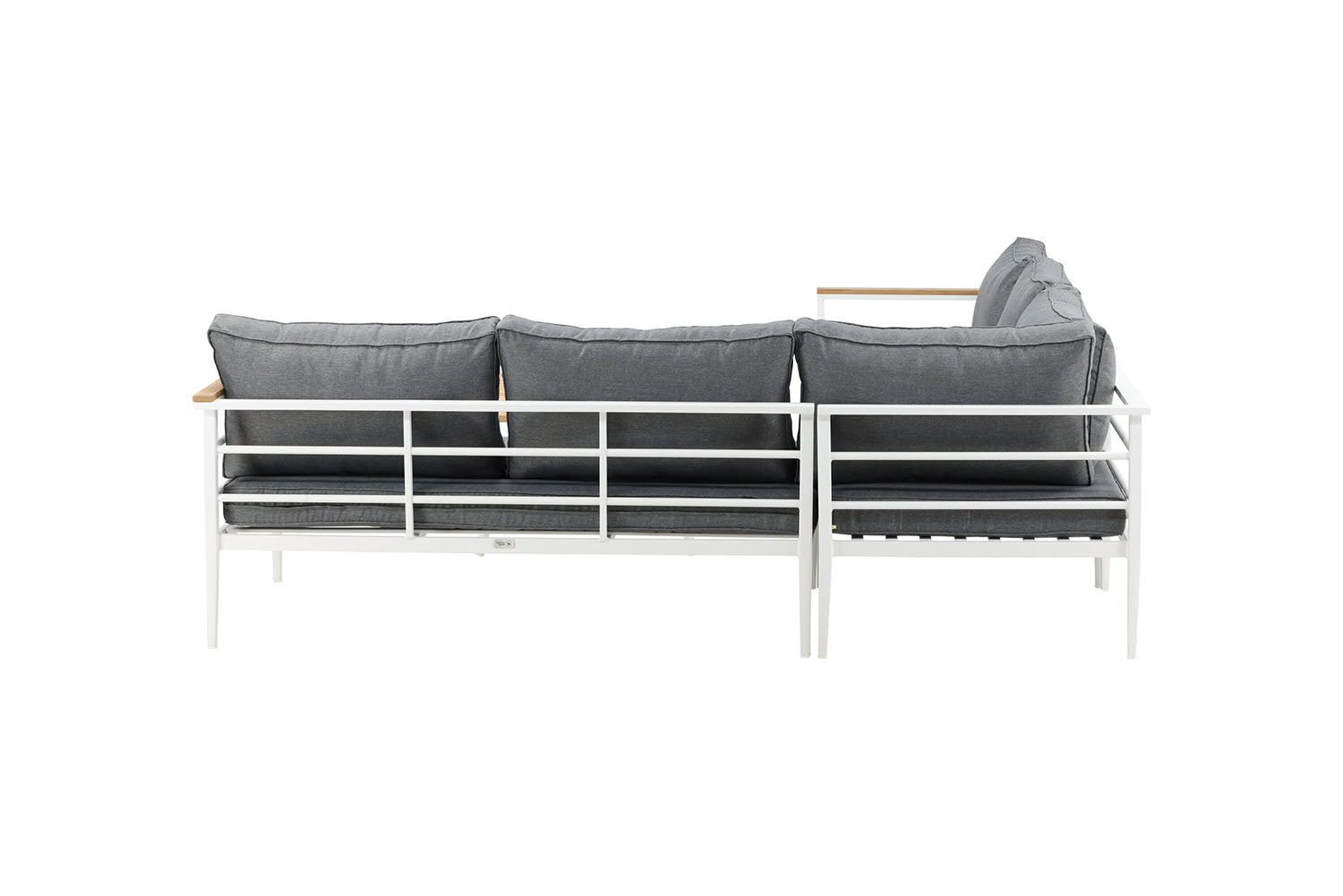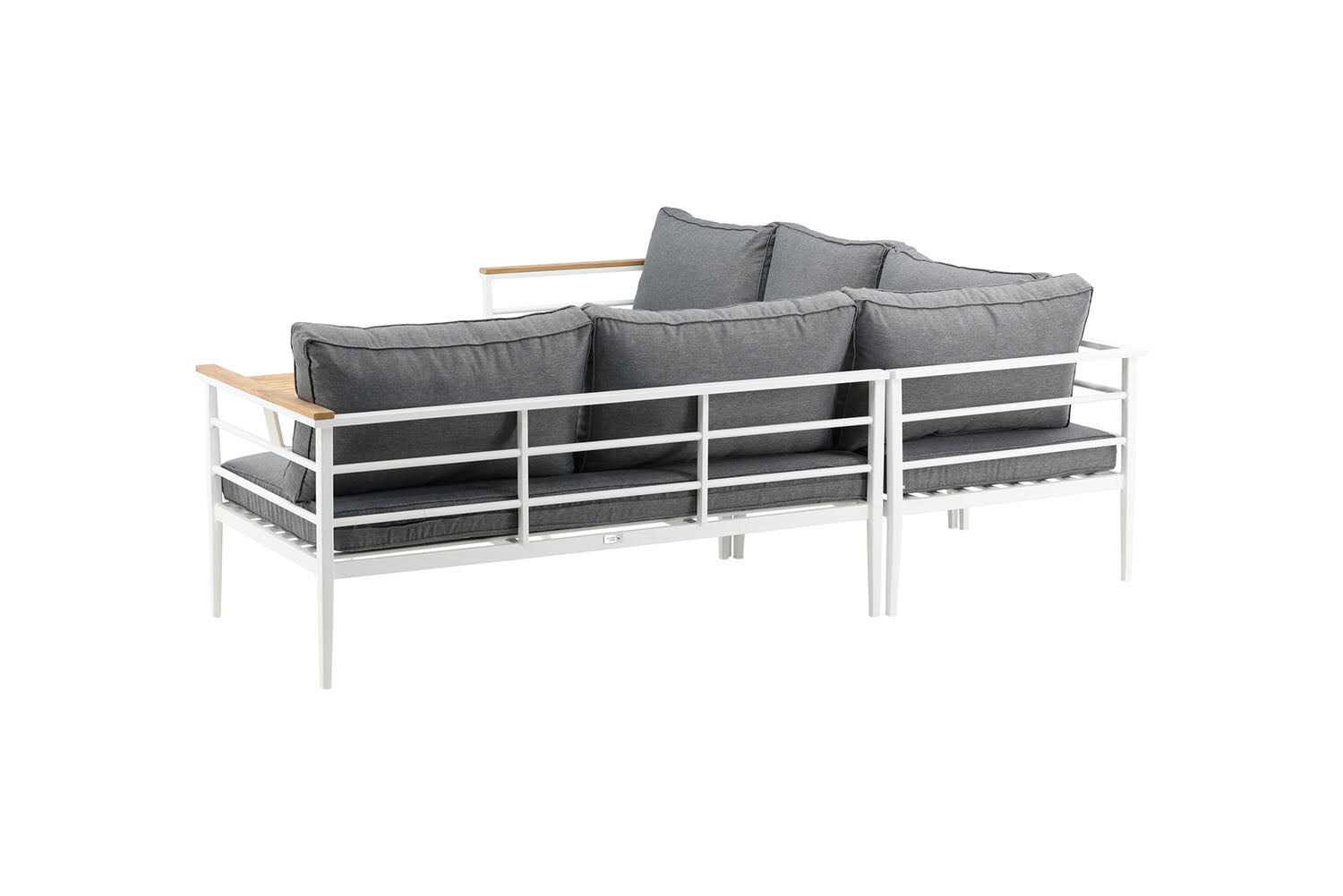 - Geniet van comfort en stijl met loungeset Tonga - een hoekbank met geïntegreerde armleuningen en teakhouten details.