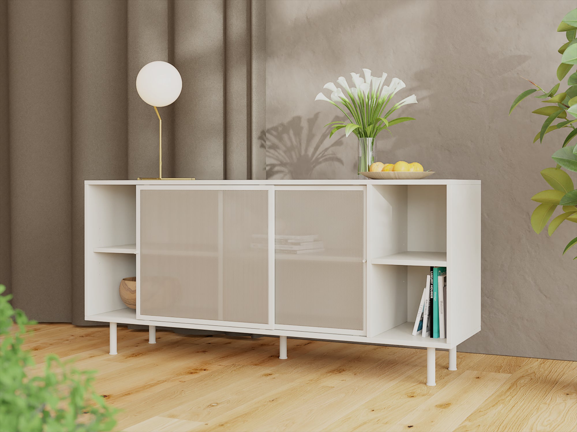 Aan de linkerkant van het dressoir bevinden zich twee schuifdeuren met daarachter een stevige plank. Deze ruimte is ideaal voor het netjes opbergen van grotere items zoals servies, tafellinnen of huishoudelijke benodigdheden. Aan de rechterkant zijn er nog twee open vakken, perfect voor het uitstallen van decoratieve objecten, boeken of voor het eenvoudig toegankelijk houden van alledaagse voorwerpen.