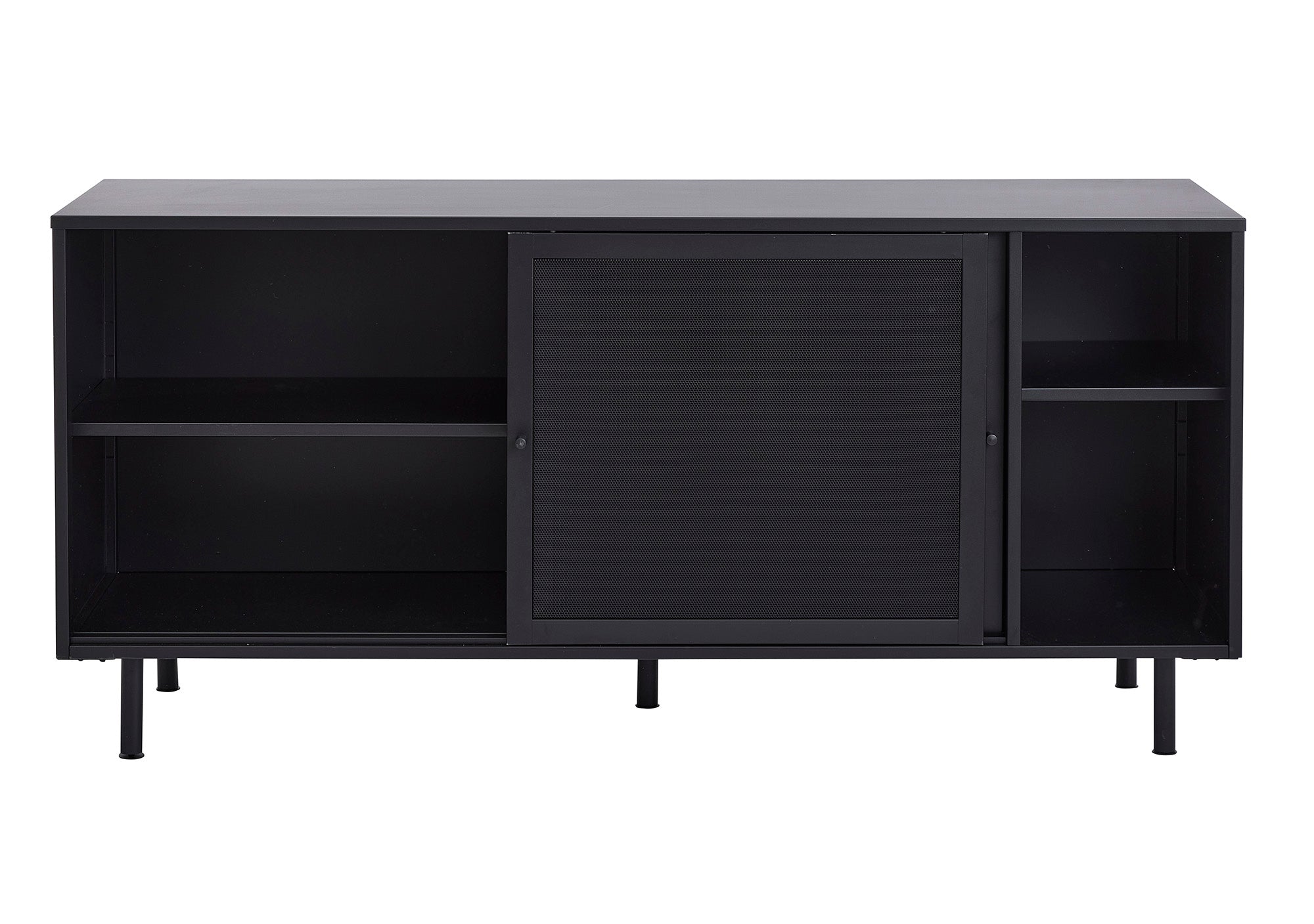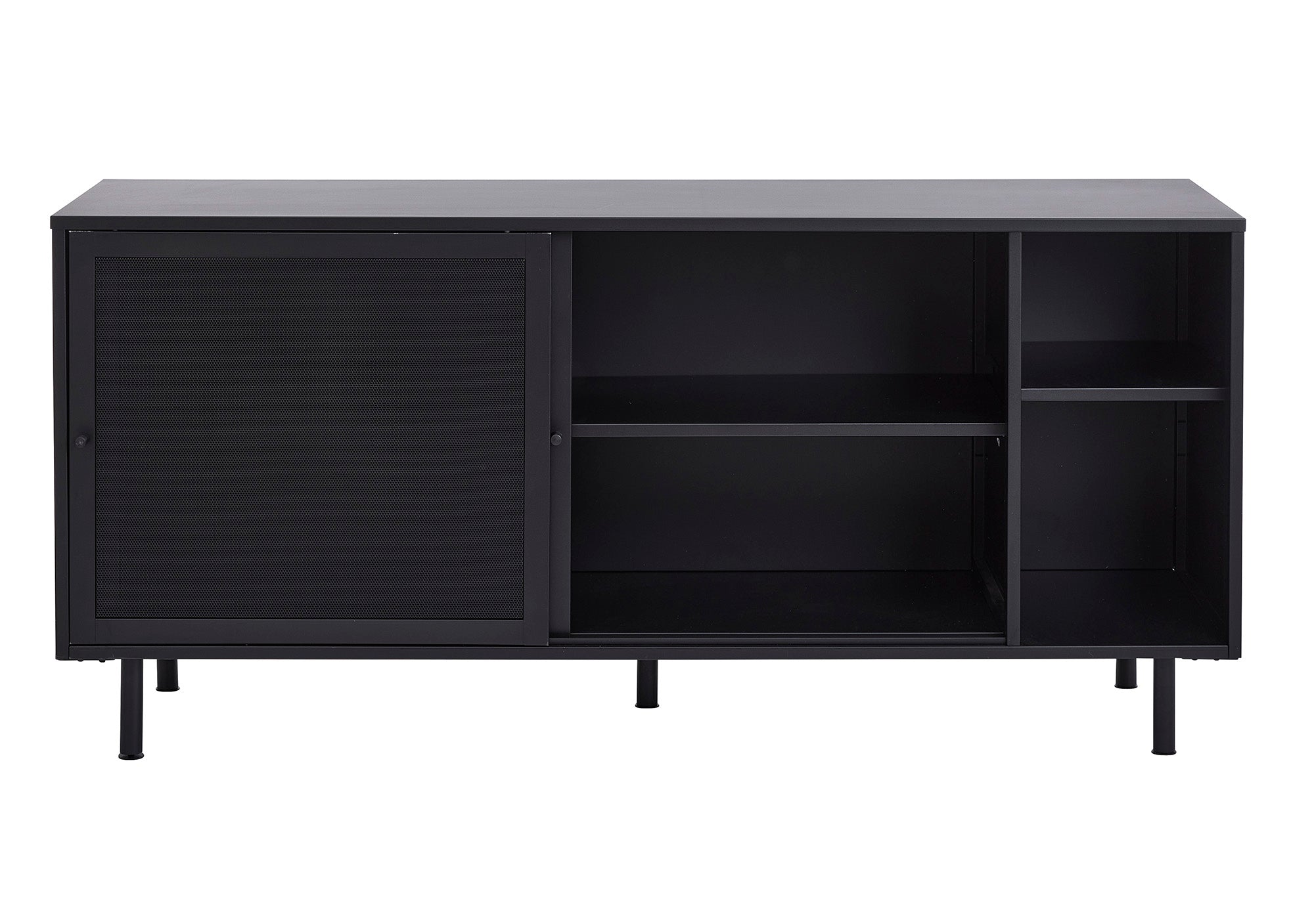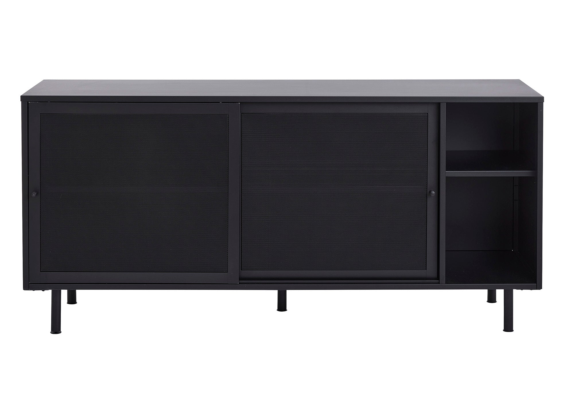 Aan de linkerkant van het dressoir bevinden zich twee schuifdeuren met daarachter een stevige plank. Deze ruimte is ideaal voor het netjes opbergen van grotere items zoals servies, tafellinnen of huishoudelijke benodigdheden. Aan de rechterkant zijn er nog twee open vakken, perfect voor het uitstallen van decoratieve objecten, boeken of voor het eenvoudig toegankelijk houden van alledaagse voorwerpen.