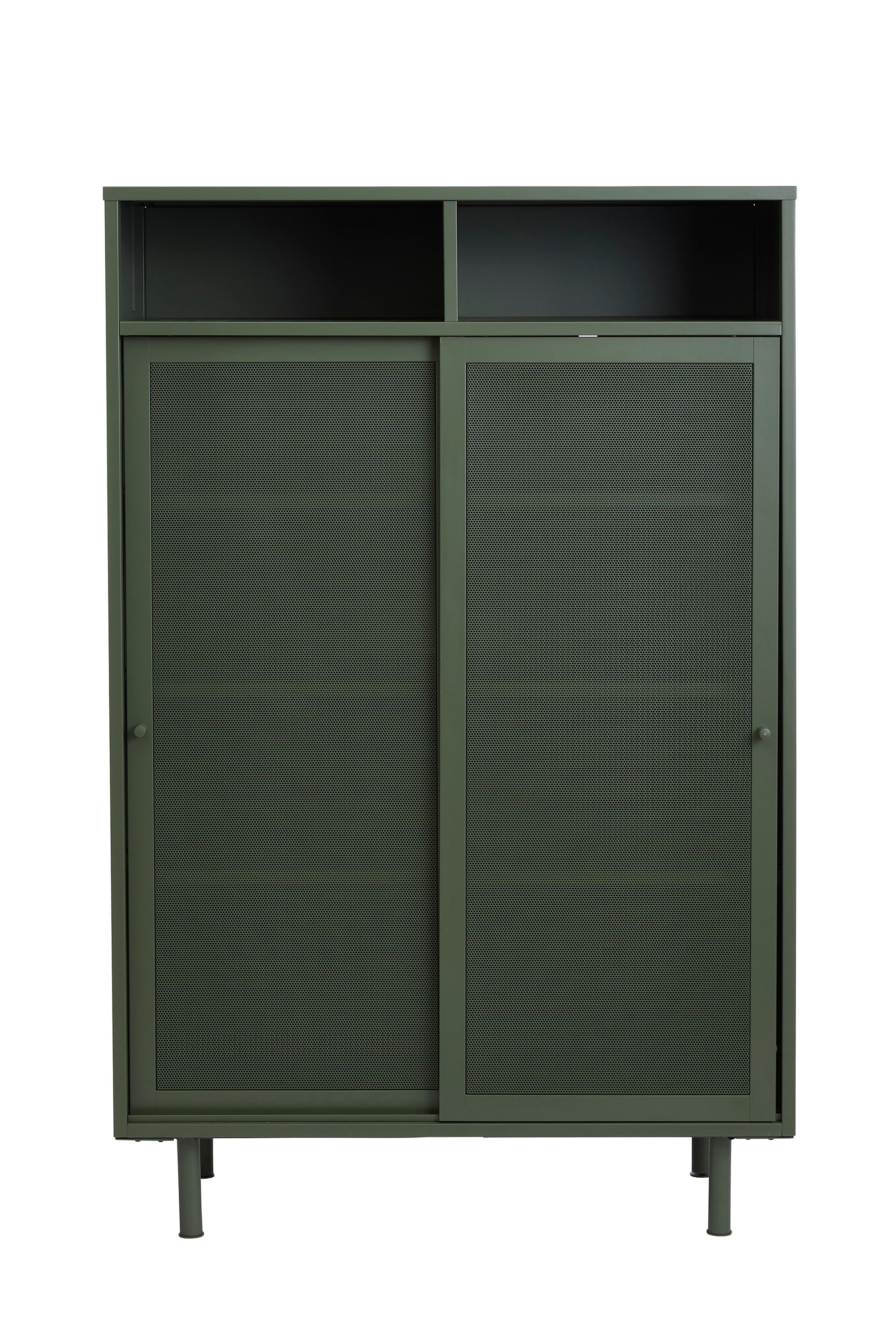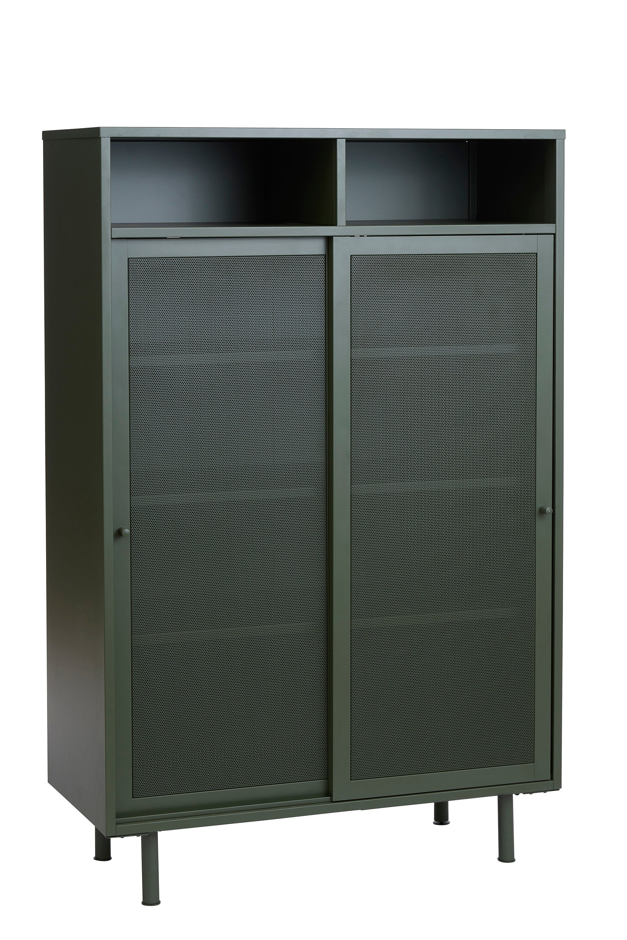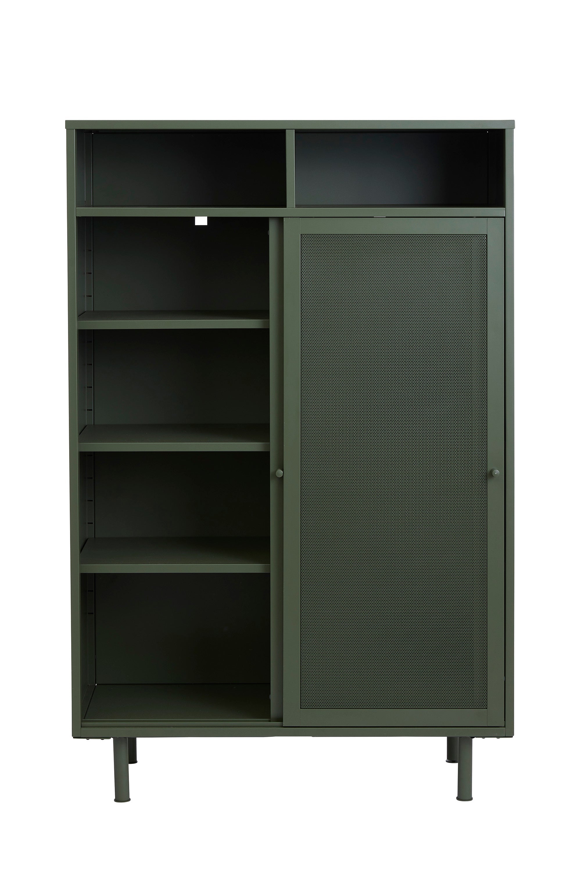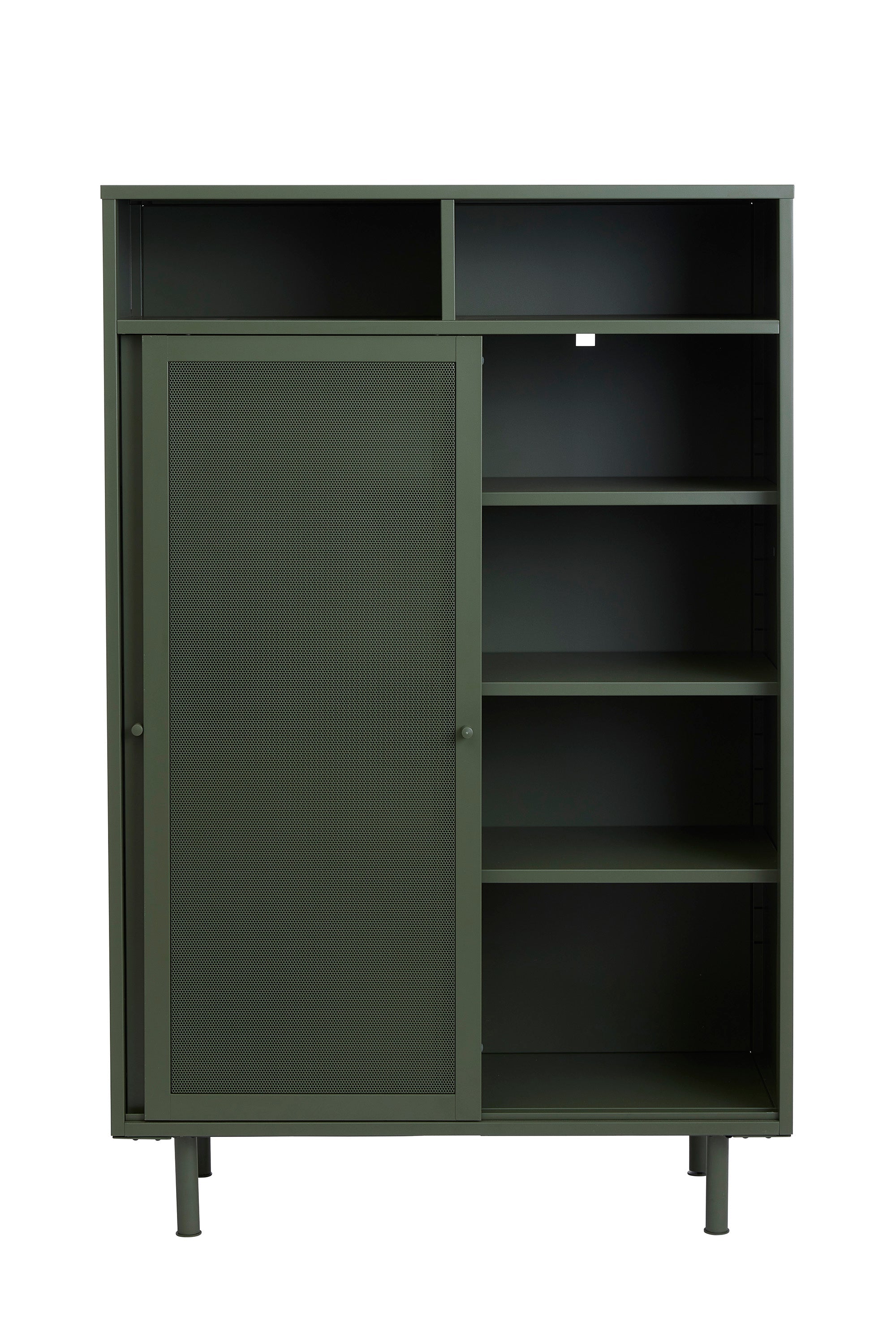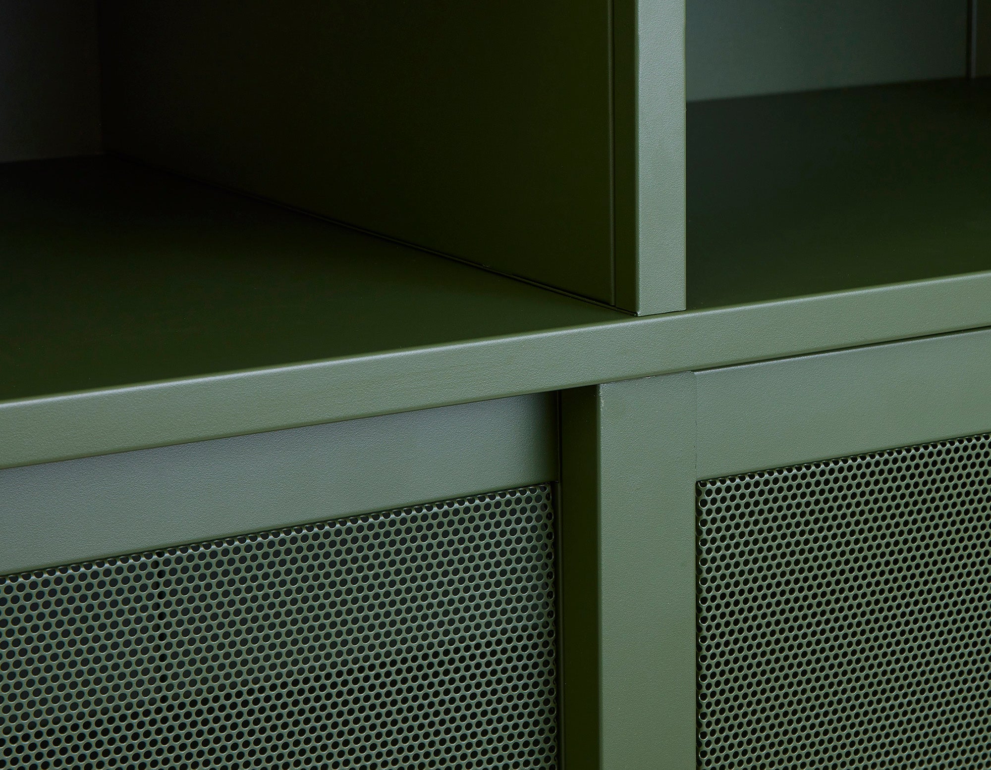 Ontdek de elegante en functionele wandkast Virke van groen metaal, een perfecte mix van minimalistische stijl en een vleugje industriële charme. Met een hoogte van 140cm biedt deze kast voldoende opbergruimte voor al je benodigdheden.
