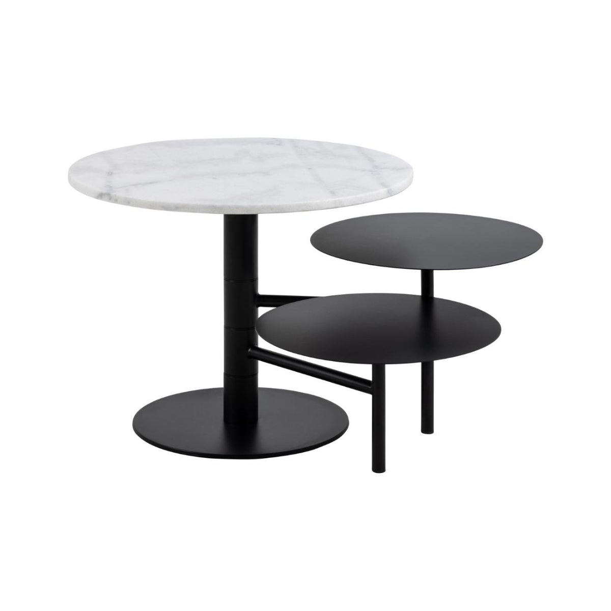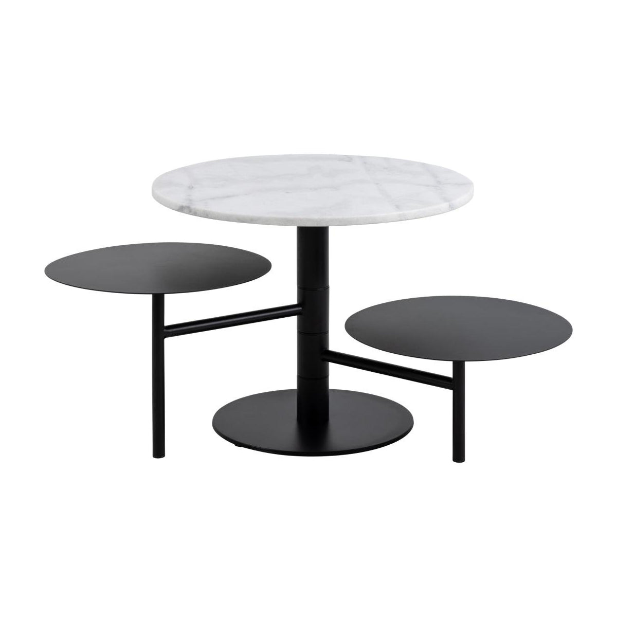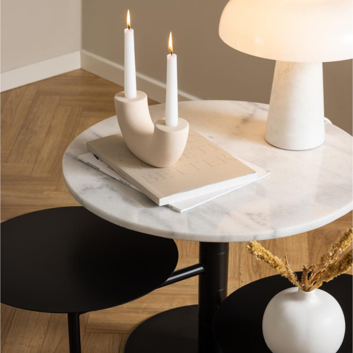 Ontdek de Zulia ronde salontafel set, een stijlvolle toevoeging aan elke moderne woonkamer. Met zijn tafelblad van wit Guangxi gepolijst marmer als middelpunt, omringd door twee draaibare armen met slanke zwarte tafelbladen op verschillende hoogtes, biedt deze tafelset een flexibele en elegante oplossing voor jouw interieur. Het contrast tussen het witte marmer en het ruwe mat zwarte gepoedercoat stalen frame creëert een prachtig centraal element dat de aandacht trekt. Flexibiliteit is voor deze salontafel erg belangrijk, je kunt namelijk de opstelling van de tafelbladen aanpassen aan jouw persoonlijke voorkeuren en de ruimte. Met zijn elegante ontwerp, biedt de Zulia salontafel set niet alleen functionaliteit maar ook een tijdloze esthetiek die goed past bij moderne interieurs.
