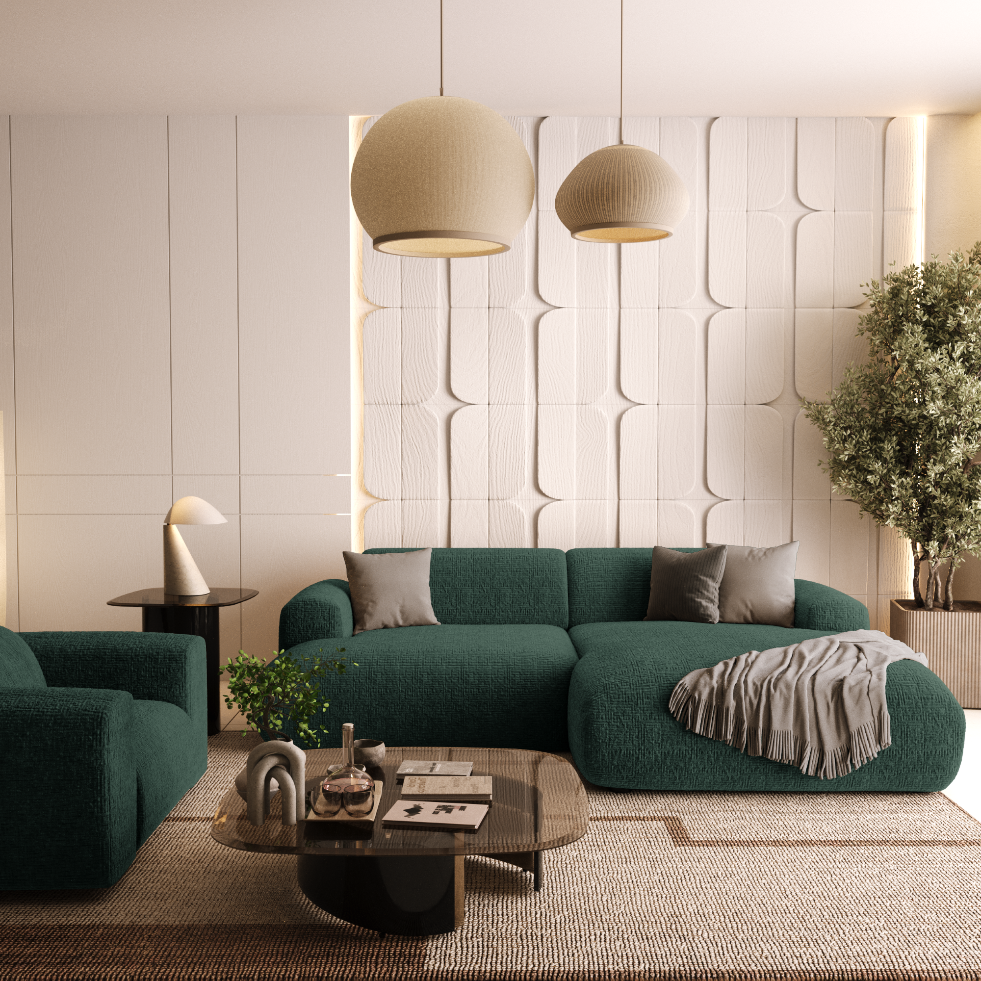 Rechterhoekbank, 4-zits, smaragdgroen fluweel met patroon, 266 cm