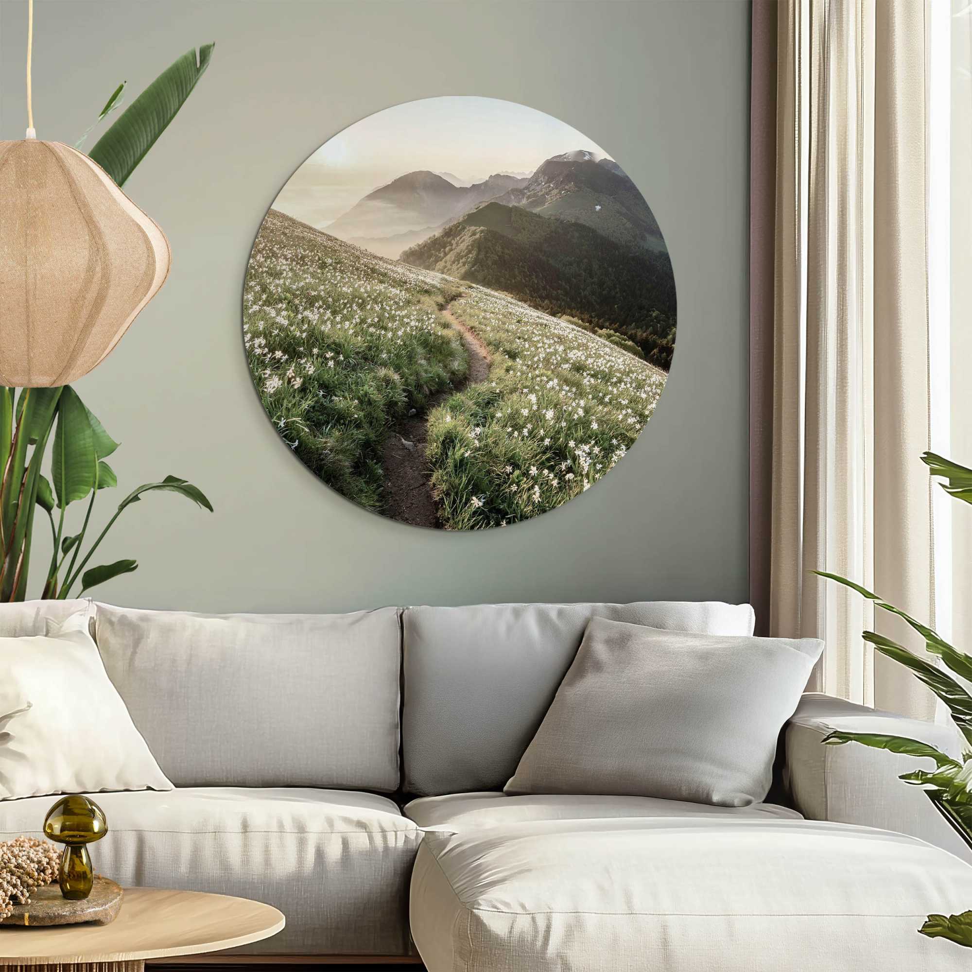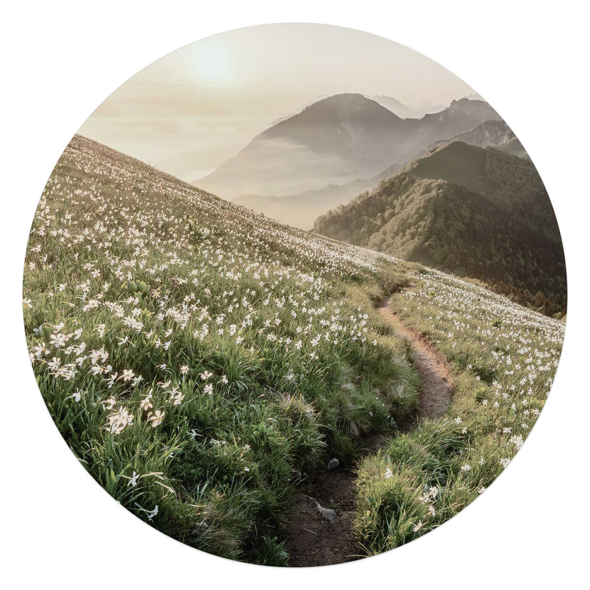 Reinders - Bergbloei in de ochtendzon - Glasschilderij Ø 70 cm - Groen
