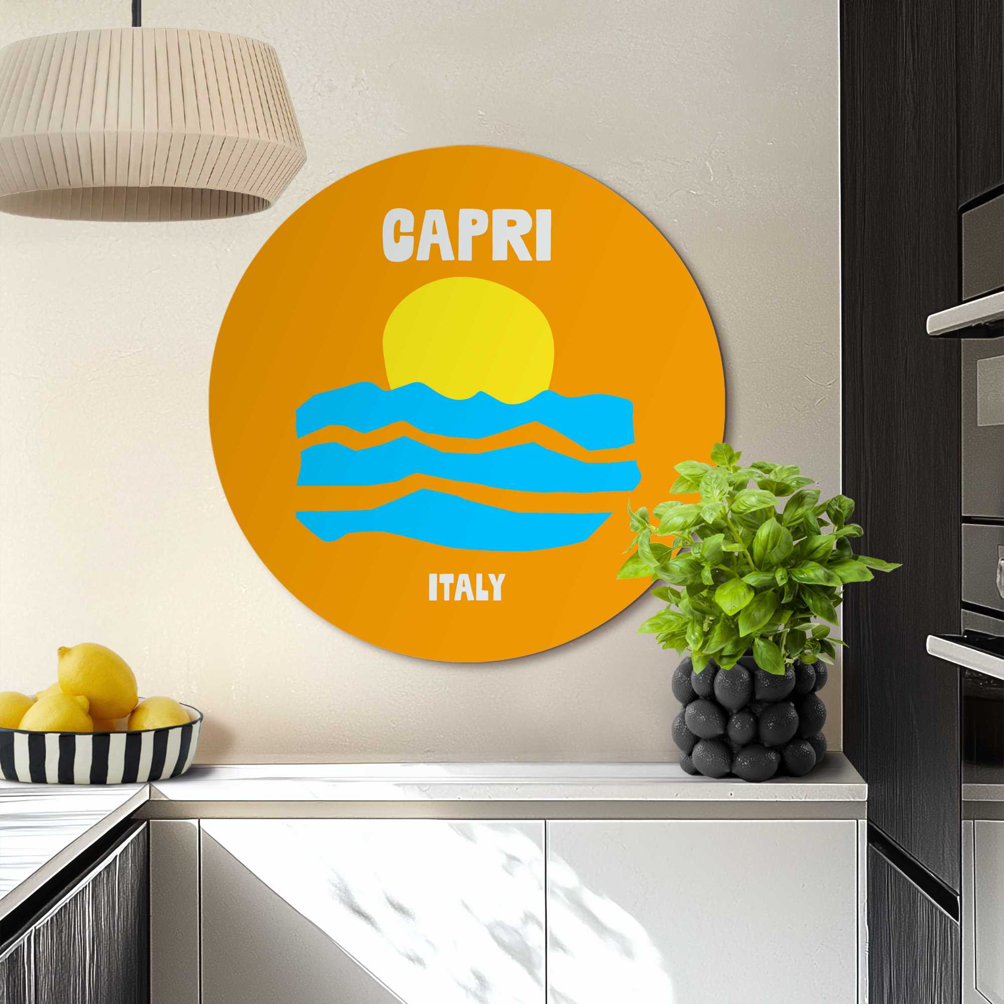 - De witte letters CAPRI boven en ITALY onder geven het geheel een frisse, vakantieachtige uitstraling