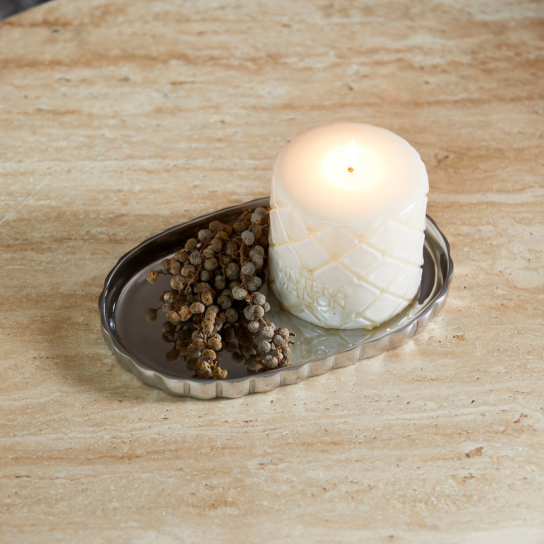 - Voeg een vleugje elegantie toe aan je decor met dit zilverkleurige dienblad. Het kleine, ovale ontwerp en de geribbelde opstaande rand maken het een verfijnd accentstuk, ideaal voor het presenteren van kaarsen of andere decoratieve items.