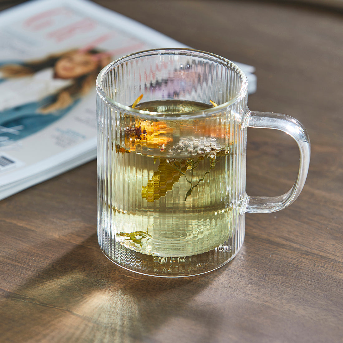 - Elegant design – Het transparante glas met verticale lijnen biedt een chique uitstraling die je koffietafel verfraait. Geschikt voor zowel dagelijks gebruik als speciale gelegenheden.