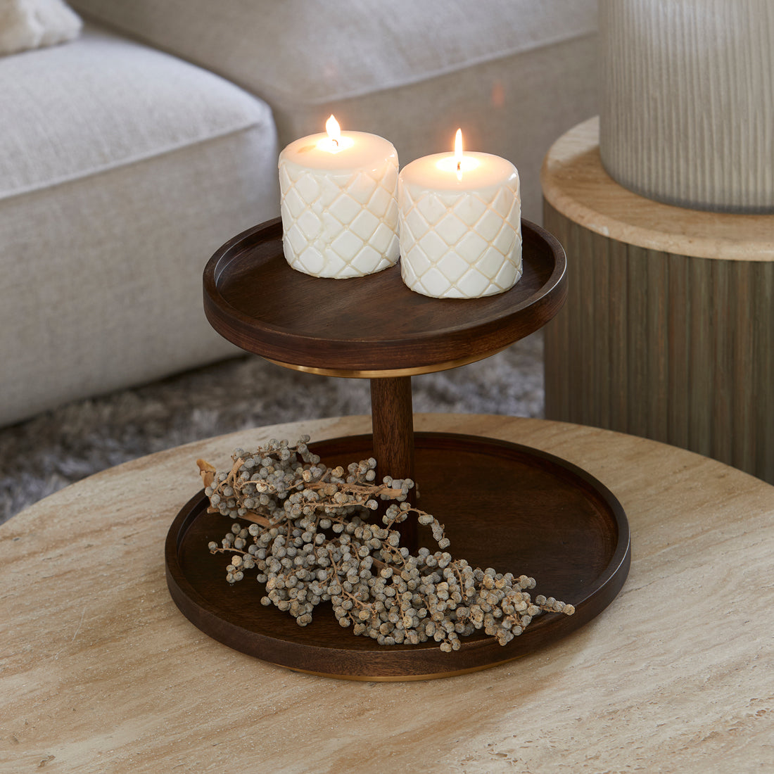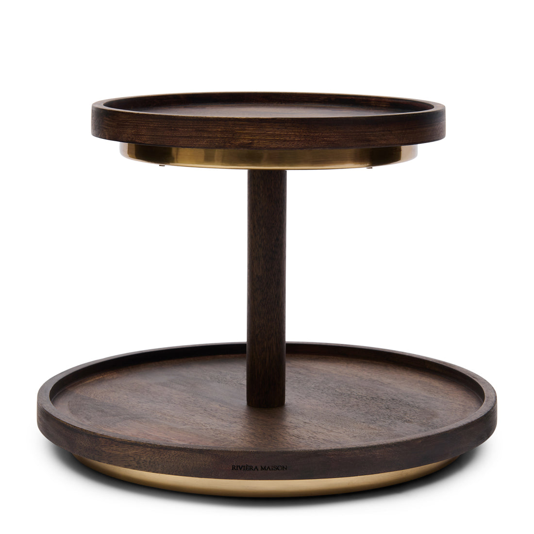 - Deze elegante etagère van donker hout, voorzien van gouden accenten onder de twee plateaus, combineert stijl en functionaliteit op een verfijnde manier. De rijke houtkleur en de glanzende gouden details creëren een luxe uitstraling, ideaal voor het presenteren van lekkernijen, sieraden of andere decoratieve items. Perfect voor een chique tafelschikking of als een opvallend stuk in je interieur, brengt deze etagère een extra vleugje glamour en klasse.
