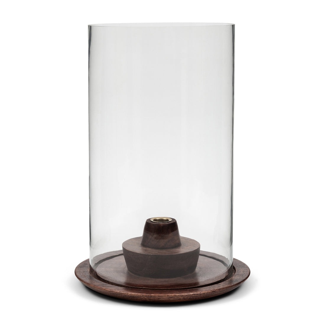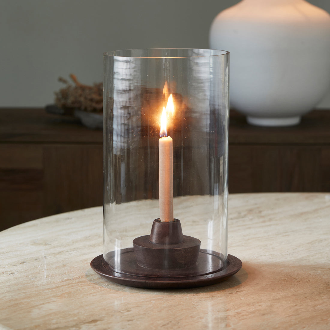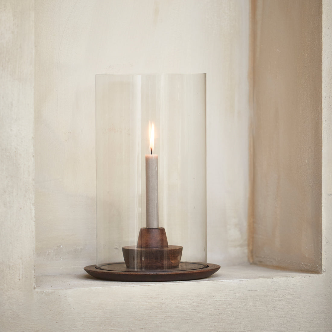 - Deze stijlvolle glazen koker, geplaatst op een plateau met een dinerkaars standaard van donker mangohout, biedt een verfijnde en luxe uitstraling. Het combinatie van het heldere glas en het rijke, donkere hout creëert een prachtig contrast dat zowel modern als tijdloos is.