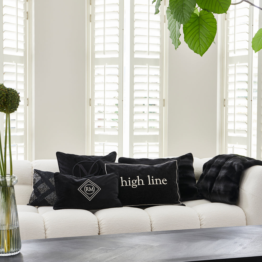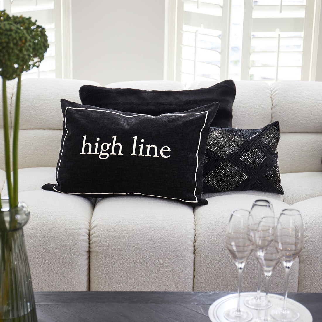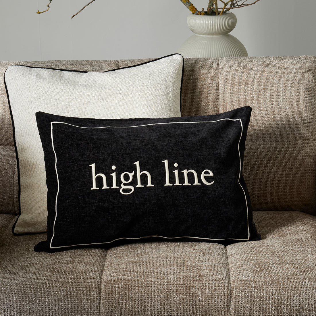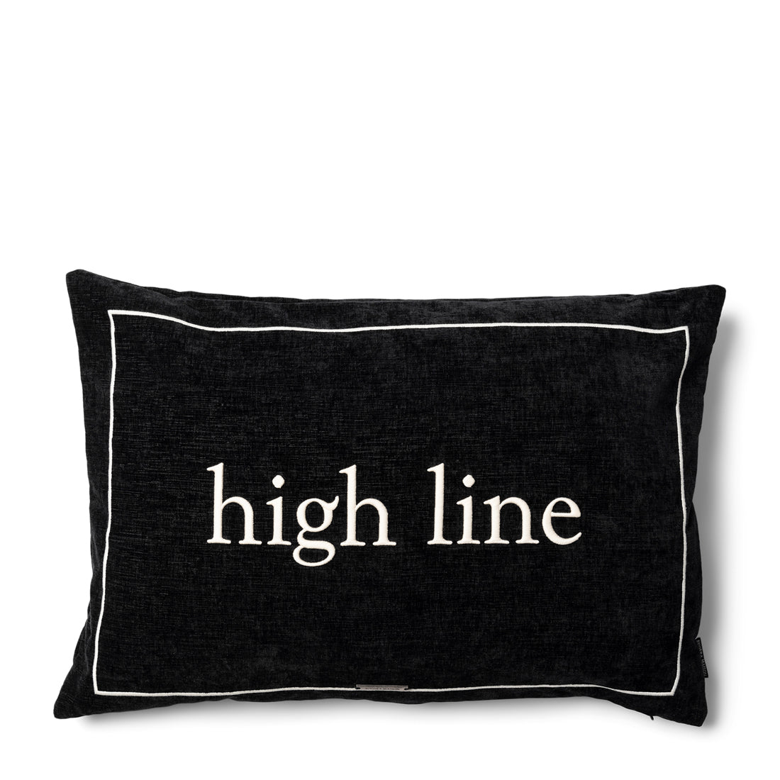 - Deze zwarte kussenhoes, gemaakt van luxe velours met een geweven textuur, voegt een verfijnde en elegante uitstraling toe aan je interieur. De witte rand biedt een strak contrast en accentueert het moderne ontwerp, terwijl de "High Line"-tekst een eigentijdse flair toevoegt. Deze kussenhoes is perfect voor het creëren van een chique, stijlvolle sfeer in je woonkamer of slaapkamer, en brengt een luxe en persoonlijke touch aan je decor.