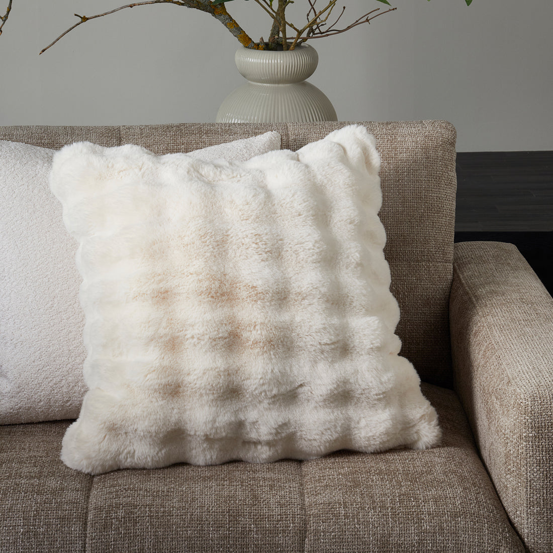 - Kruip heerlijk weg tegen dit witte kussenhoes van imitatiebont. De stof is luxueus met bollingen en voelt aan als een echte vacht, super zacht! Ideaal om je huis een knusse uitstraling te geven.