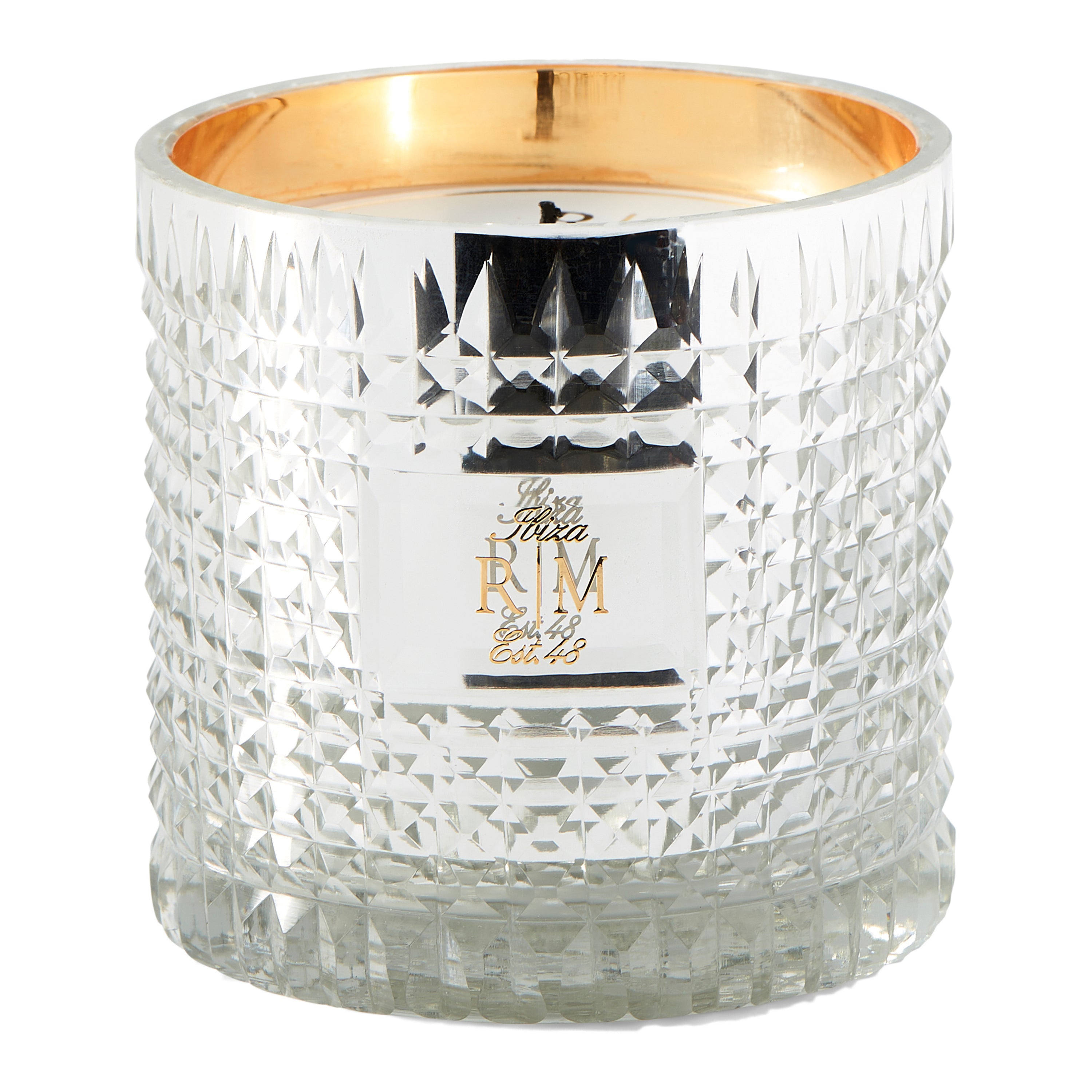 - De glazen houder is volledig bedekt met spiegelende facetten