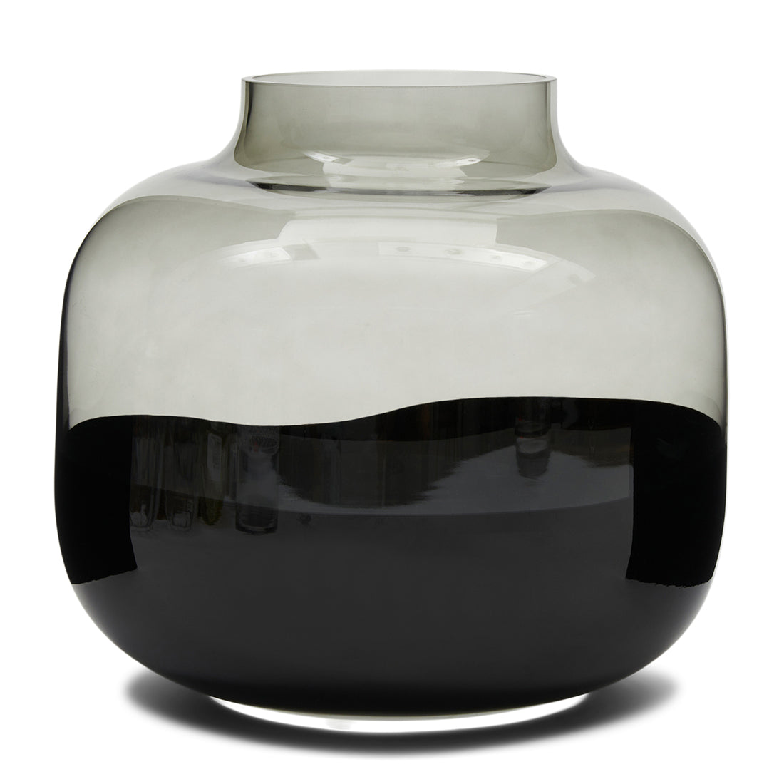 De RM Moraea Vase is een wijde, bolle bloemenvaas van smoked glas. Aan de bovenkant is het glas grijsgroen en aan de onderzijde is het glas zwart en niet transparant. De stoere vaas heeft een relatief smalle opening met een strak snijvlak.