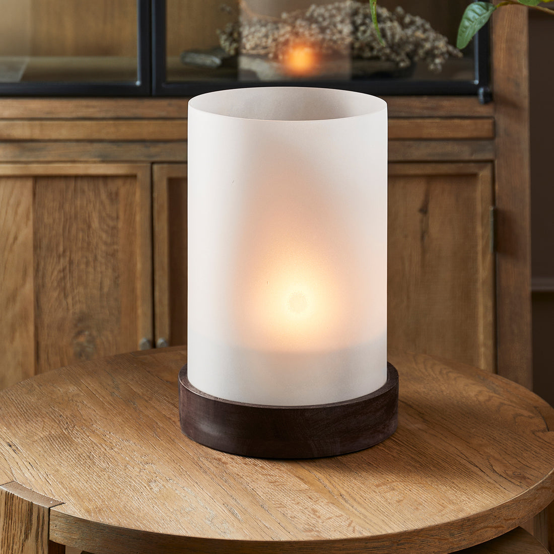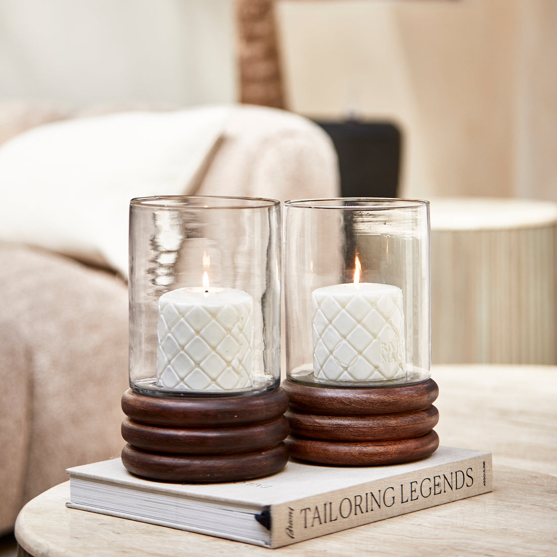 - Dit indrukwekkende windlicht bestaat uit een elegante glazen koker op een robuuste standaard van donker mangohout. Het contrast tussen het verfijnde glas en het stevige hout zorgt voor een stijlvolle en moderne uitstraling. Ideaal voor het verlichten van je ruimte met een kaars, voegt dit windlicht zowel charme als een robuuste elegantie toe aan je interieur.