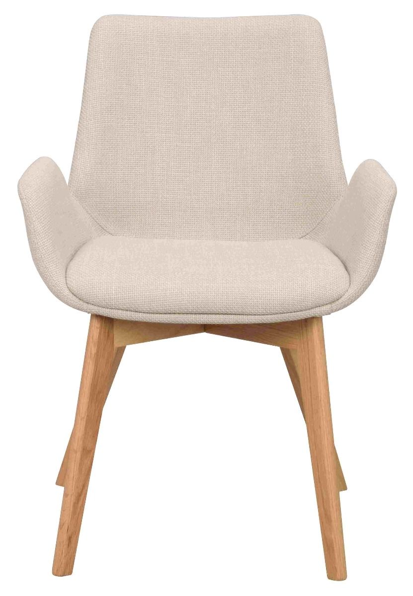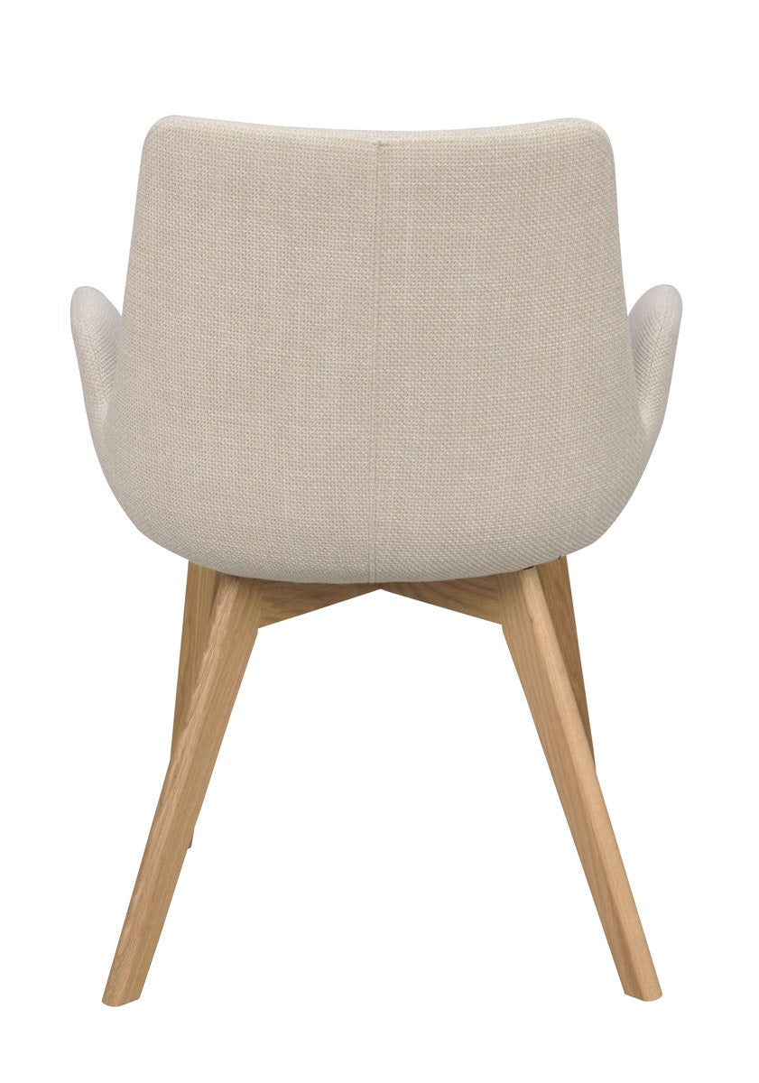 Het onderstel van de stoel is gemaakt van massief eikenhout met een FSC-keurmerk en heeft een naturel houtkleur. De zitting is gemaakt met polyesterschuim en een zachte polyester bekleding in één van de drie beschikbare kleuren: beige, groen of grijs. Deze eetkamerstoel is door zijn zachte zitting en hoge armleuningen perfect voor lange etentjes en borrels rond de eettafel. Combineer met een mooie houten eettafel voor de ultieme Scandinavische sfeer in je eethoek.