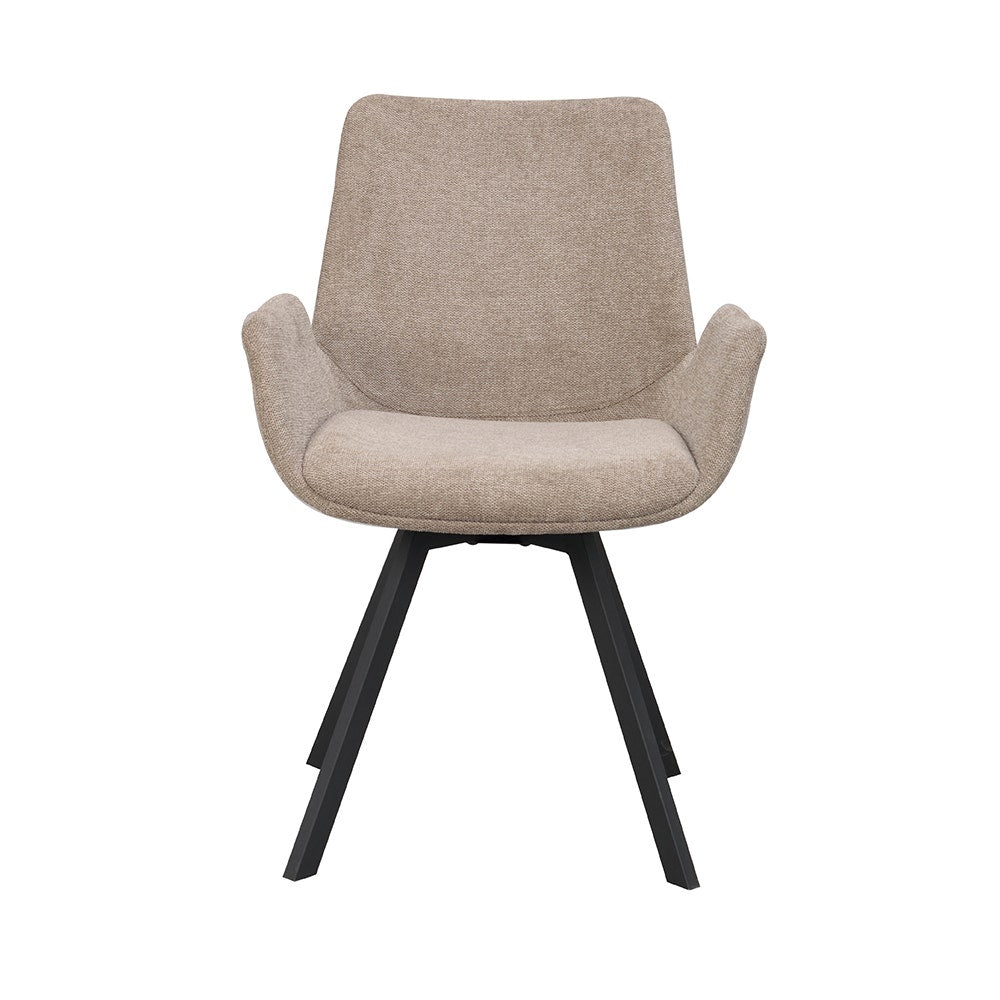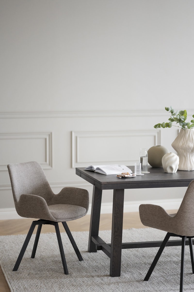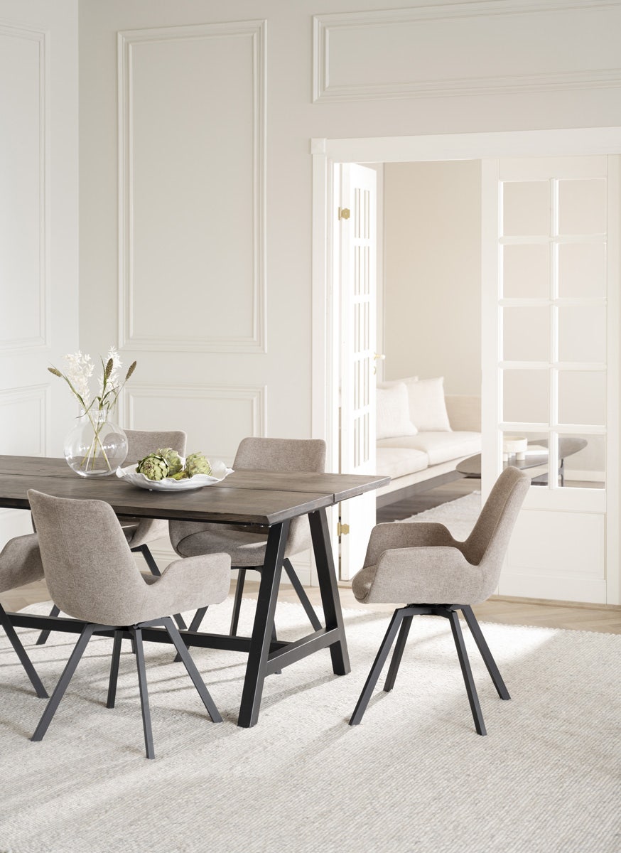 De eetkamerstoel heeft een metalen onderstel met zwarte poedercoating en een zitting bekleed met zachte polyester stof. De Norwell stoel is de perfecte combinatie van stijl en functionaliteit: tijdloos Scandinavisch design met een 360 graden draaibare zitting. Hierdoor zit je flexibel aan de eettafel en hoef je de stoel minder te verschuiven. Dankzij de armleuningen zit je extra comfortabel en kan je urenlang genieten van goede gesprekken na het diner. Naast als eetkamerstoel is Norwell natuurlijk ook geschikt om als bureaustoel te gebruiken.