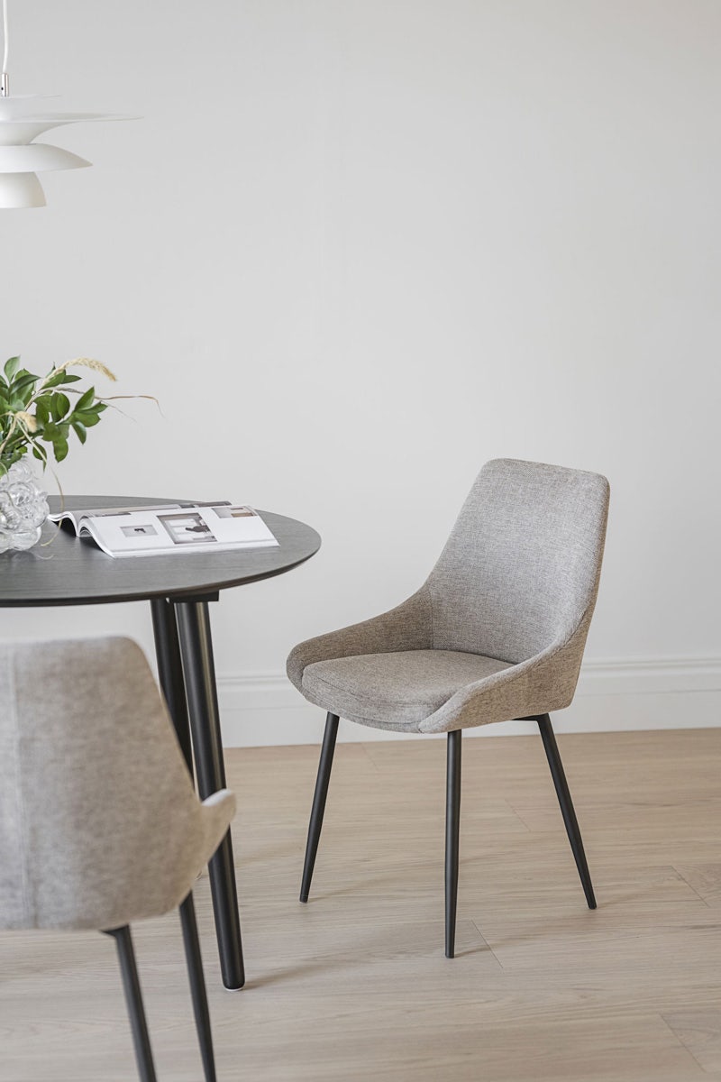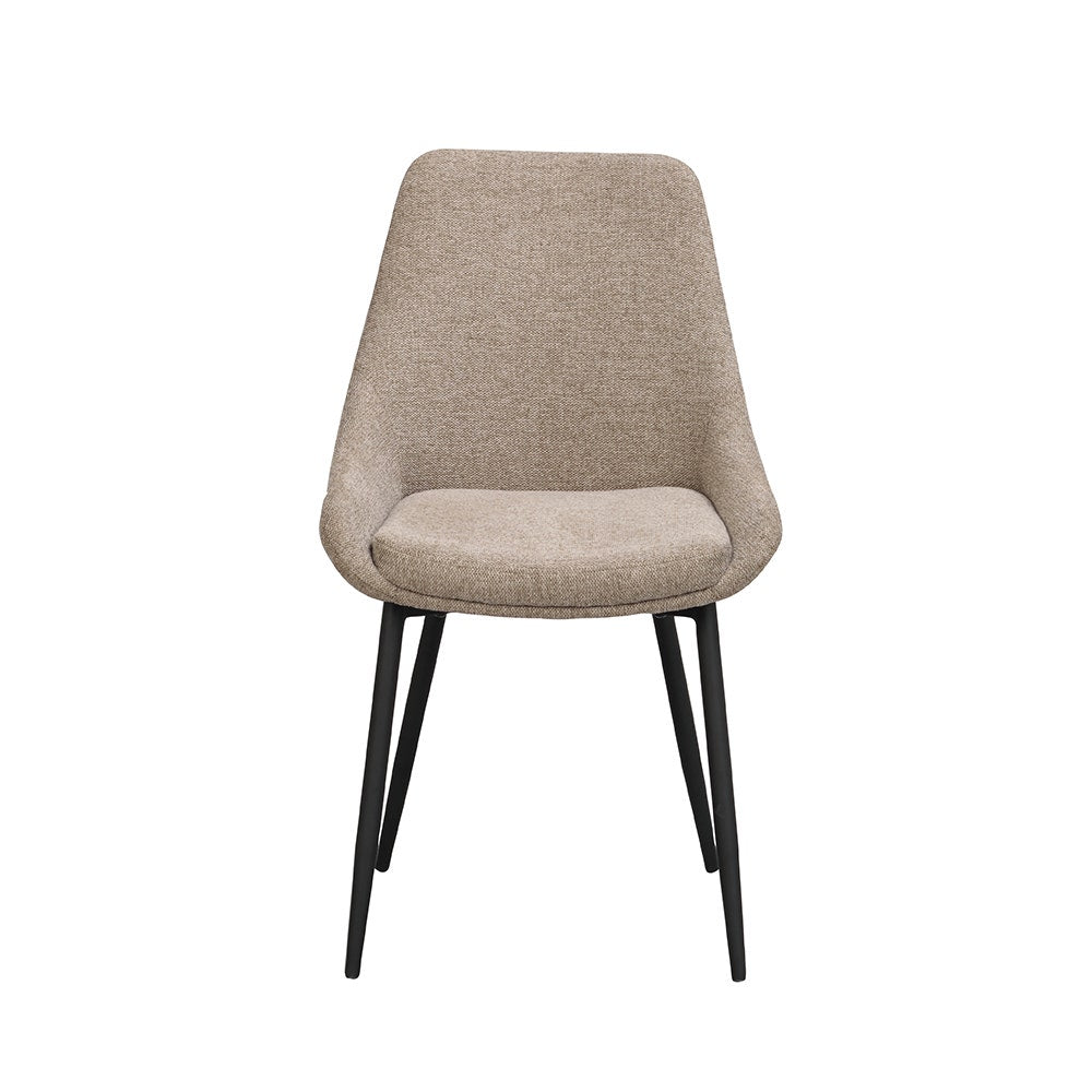 De eetkamerstoel heeft een zitting die volledig is bekleed met zachte stof. Hierdoor zit je urenlang comfortabel. De gemêleerde stof heeft een neutrale beige kleur en past daardoor in elk interieur en elke woonstijl. Het onderstel is gemaakt van metaal met een zwarte poedercoating. Maak je eetkamer knus en sfeervol door deze moderne stoel aan jouw eettafel te schuiven.
