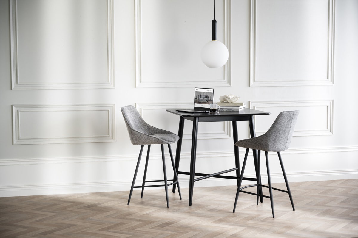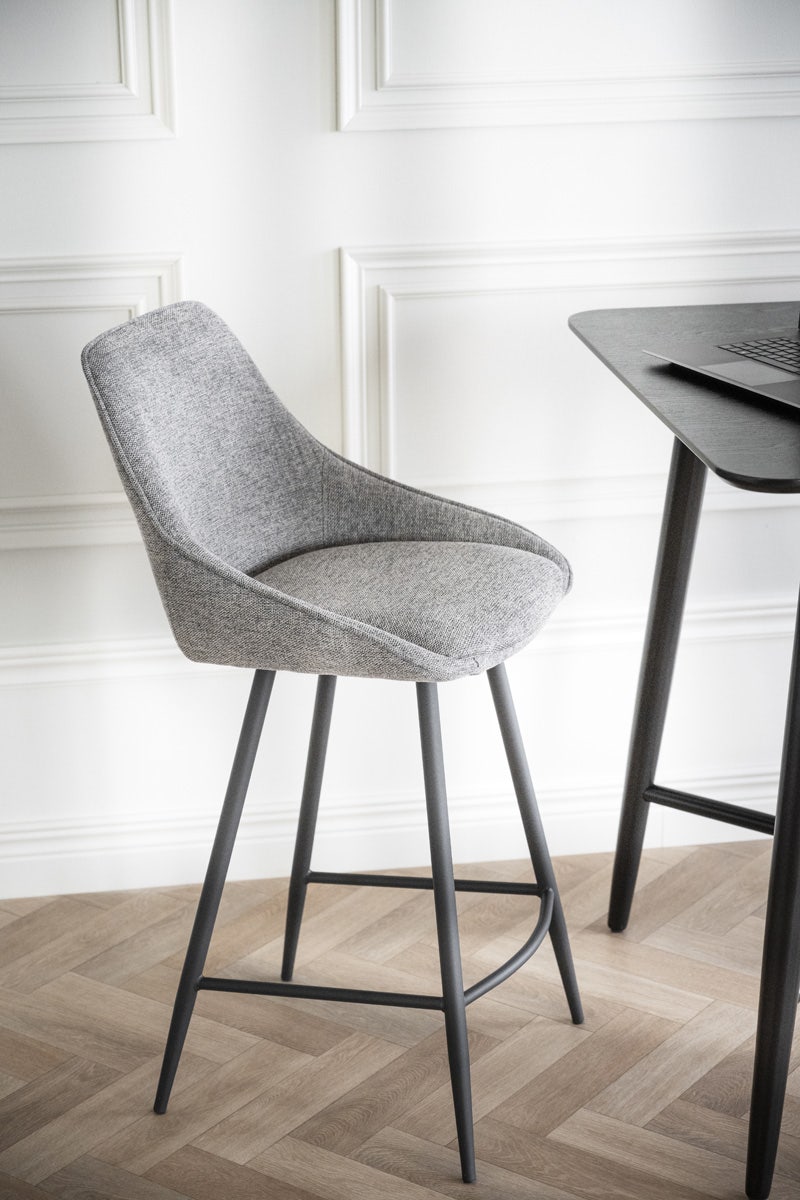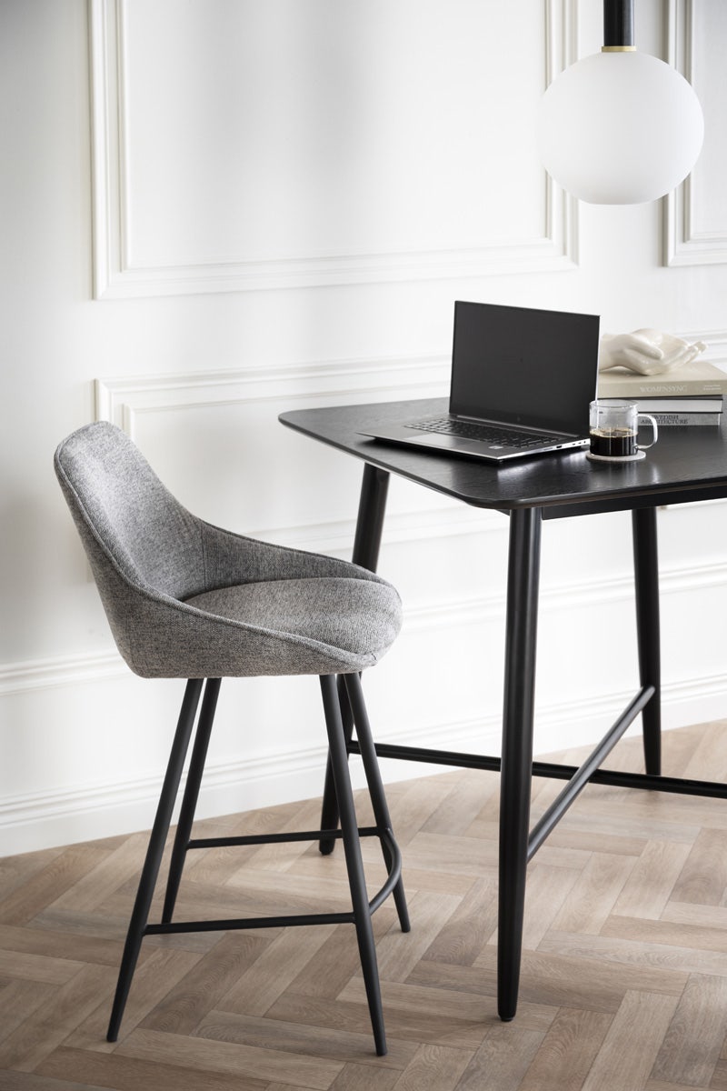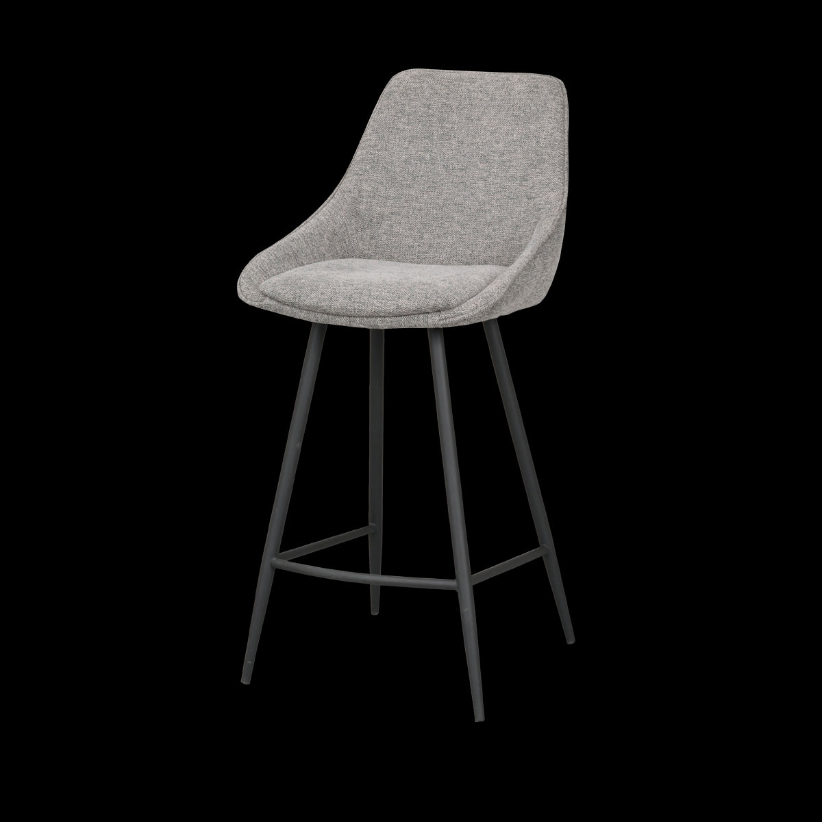 De barkruk heeft een zithoogte van 67 cm en is daardoor geschikt voor aan een keukeneiland. Het onderstel van de barkruk is gemaakt van gepoedercoat metaal en de zitting is bekleed met een zachte grijze stof van 100% polyester. Deze gemêleerde stof zorgt voor een warme uitstraling en veel zitcomfort. De voetensteun op het frame draagt verder bij aan het comfort.