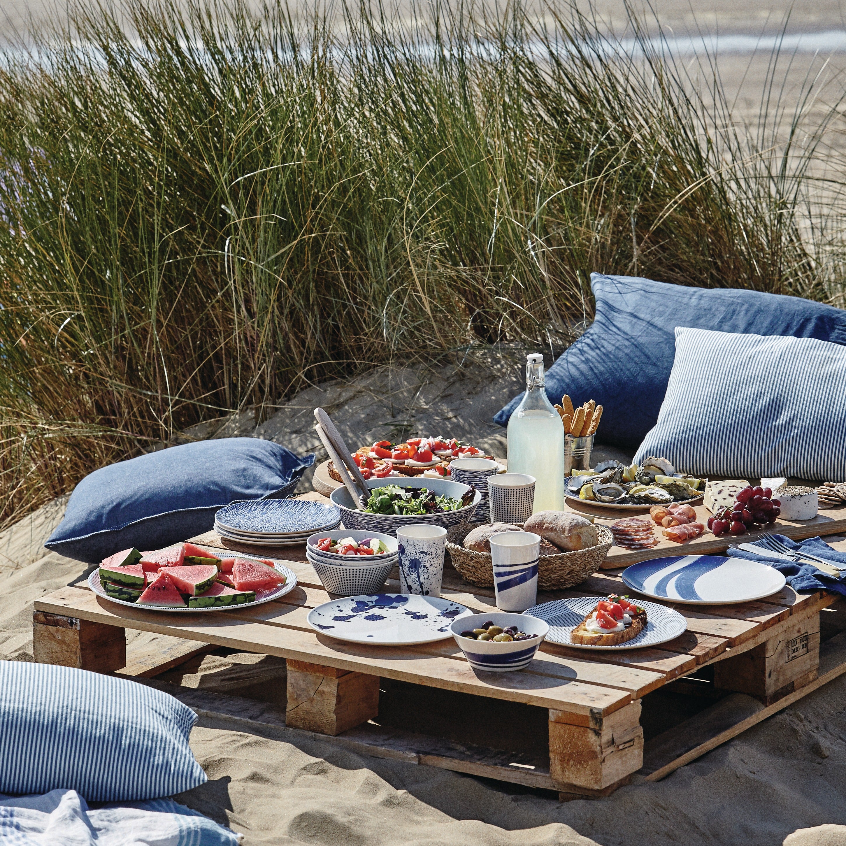 Royal Doulton Pacific Outdoor Op het strand ontdek je schelpen, zie je golven en de diepblauwe zee. Het Pacific servies van Royal Doulton is gebaseerd op die prachtige momenten op het strand. Het witte servies is versierd met diep blauwe stippen, lijnen of verfspetters waarmee je gemixt ook een prachtige tafel dekt.