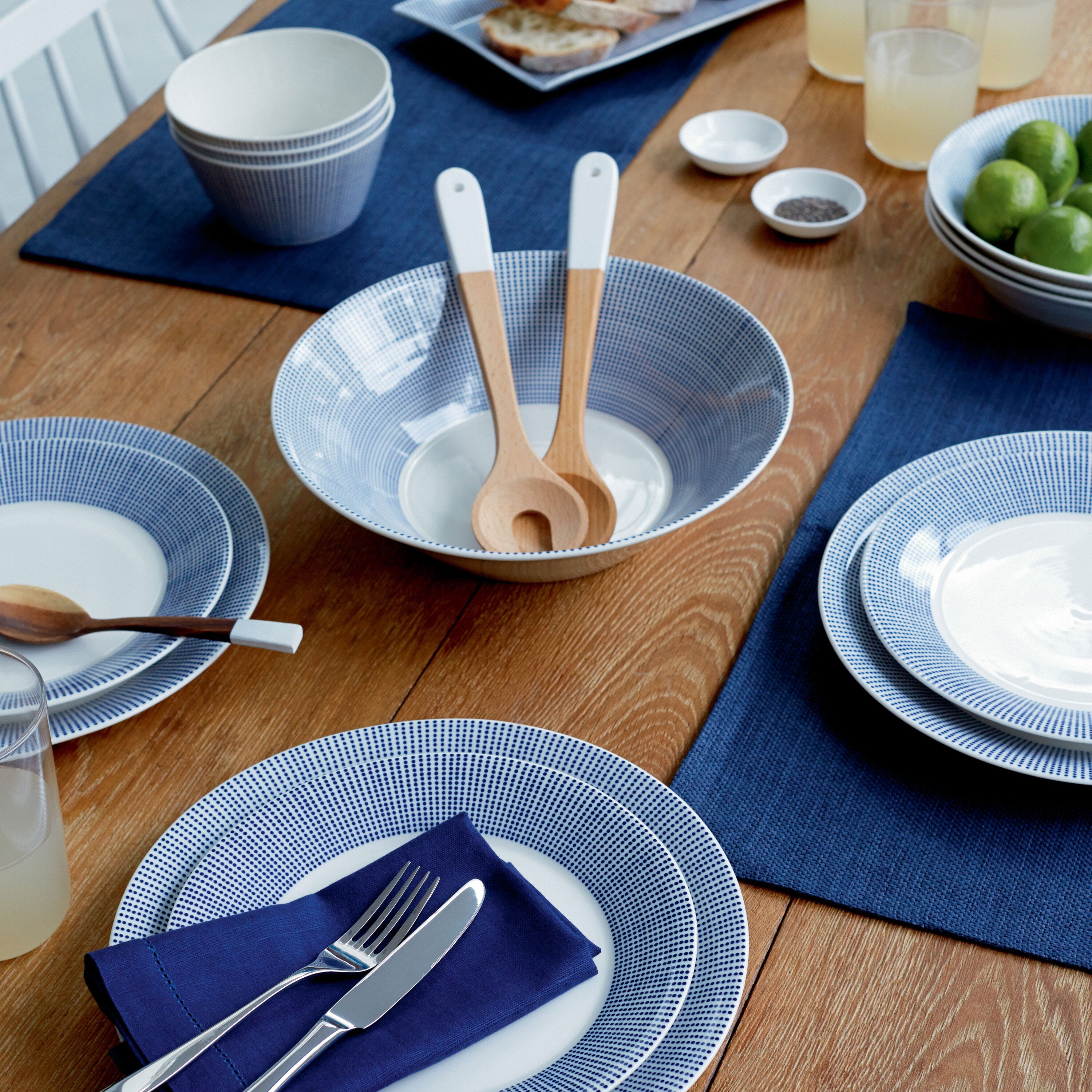Royal Doulton Pacific Op het strand ontdek je schelpen, zie je golven en de diepblauwe zee. Het Pacific servies van Royal Doulton is gebaseerd op die prachtige momenten op het strand. Het witte servies is versierd met diep blauwe stippen, lijnen of verfspetters waarmee je gemixt ook een prachtige tafel dekt. Het servies is geschikt voor de vaatwasser en de magnetron.