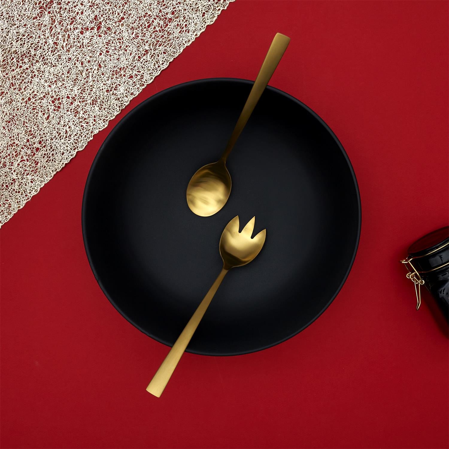 Wat staat er vandaag op het menu? Een heerlijke salade met pesto en pijnboompitjes of toch die couscoussalade met falafelballetjes? Meng en serveer iedere salade die je maar wil met deze mooie en handige set uit de collectie van CASA DI ELTURO. Het slabestek is gemaakt van metaal met een mat gouden finish voor een luxe uitstraling. De set bestaat uit twee stuks bestek, een ‘lepel’ en een ‘vork’. Ze zijn beide 20 cm hoog en kunnen in de vaatwasser.