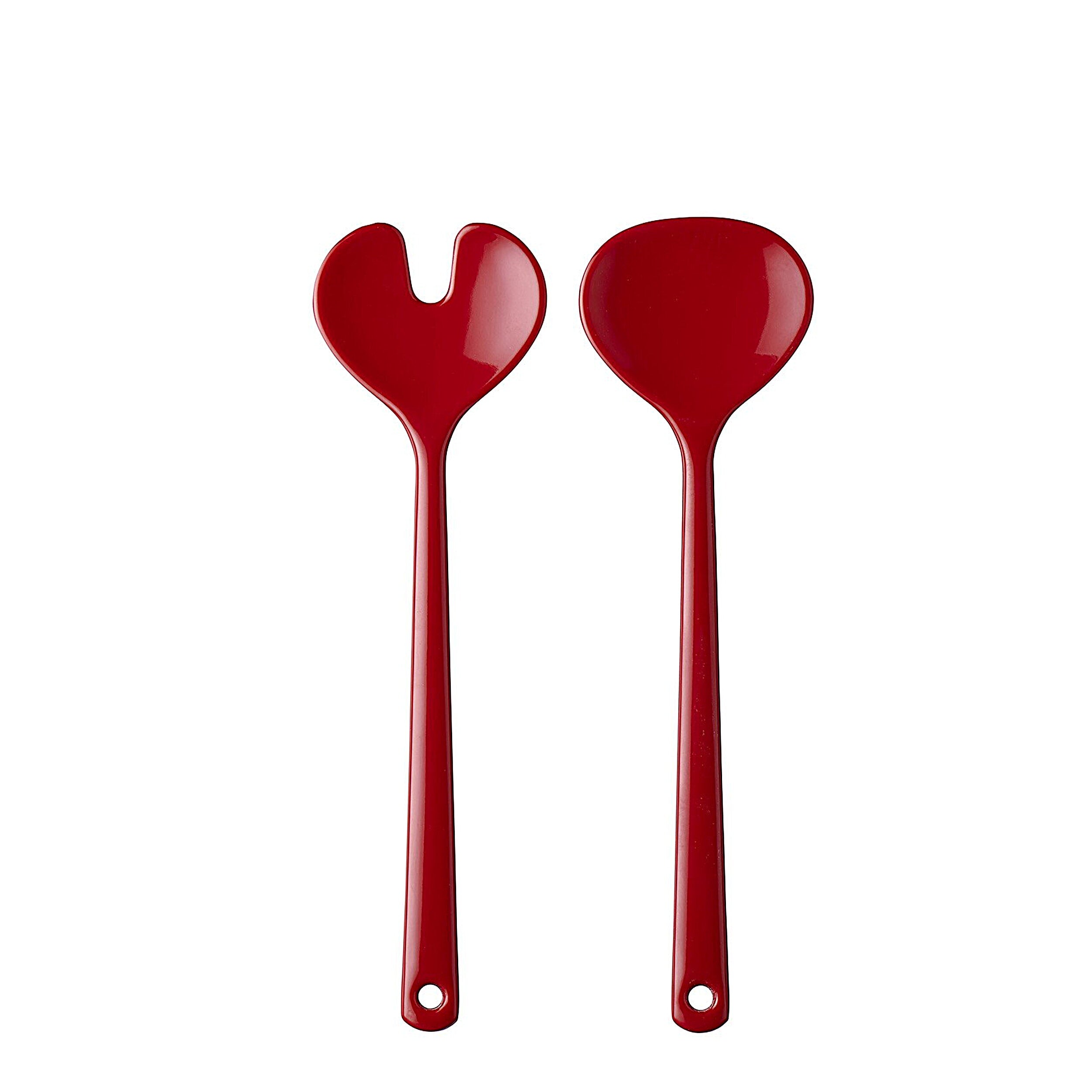 Slacouvert Synthesis in de kleur luna rood. Dit 2-delige slabestek bestaat uit een grote slalepel en slavork en past perfect bij de rode saladeschaal Synthesis 2.5 of 4.0 liter.