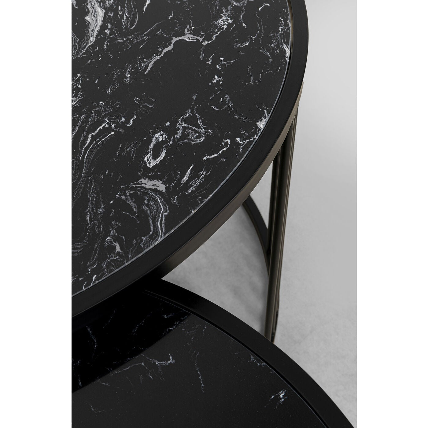 Deze retro salontafels brengen een verfijnde elegantie in je huis met hun stalen frame en zwart mineraal marmeren blad.Maximaal draagvermogen: 80 kg. Elk stuk is uniek. Geleverd met verwijderd blad.