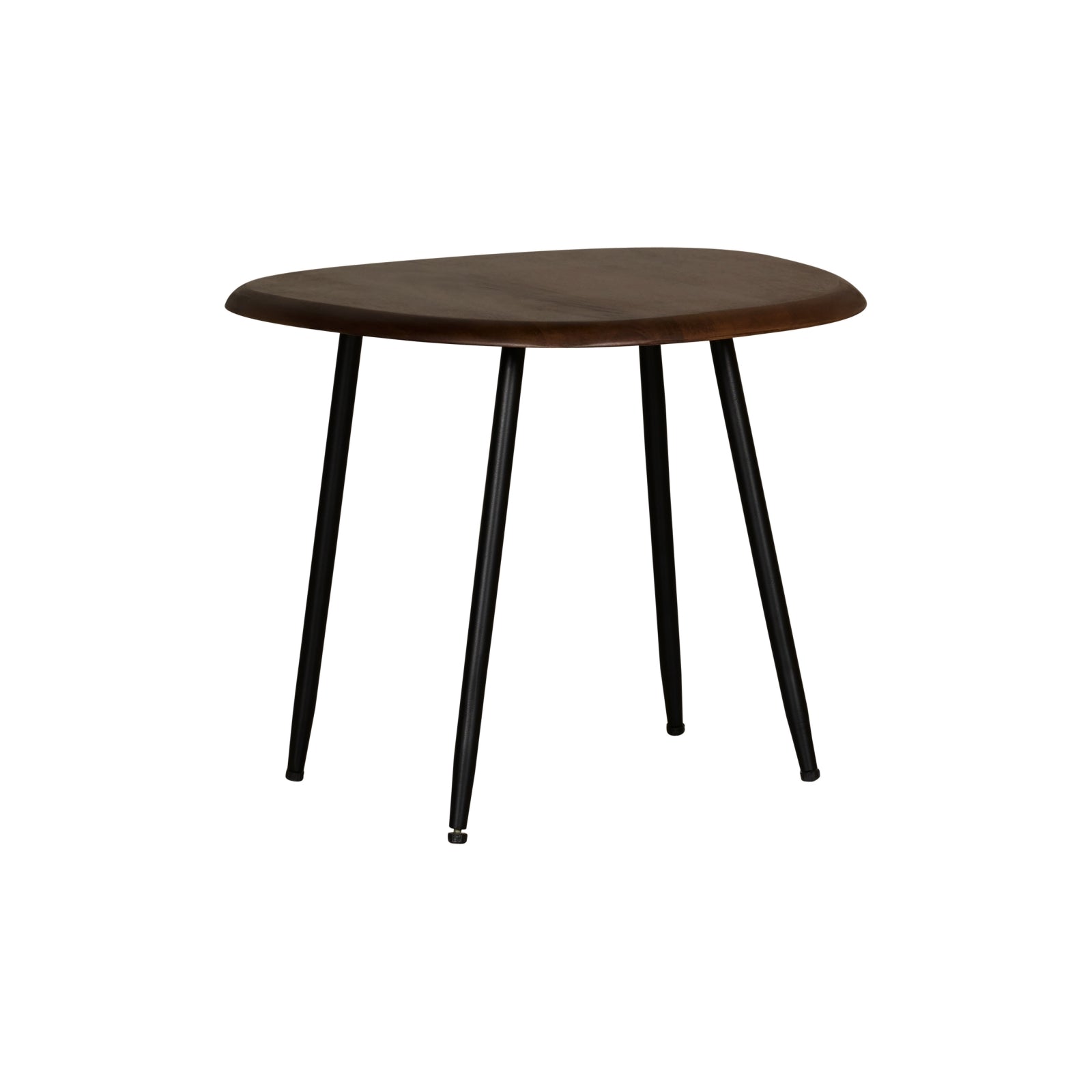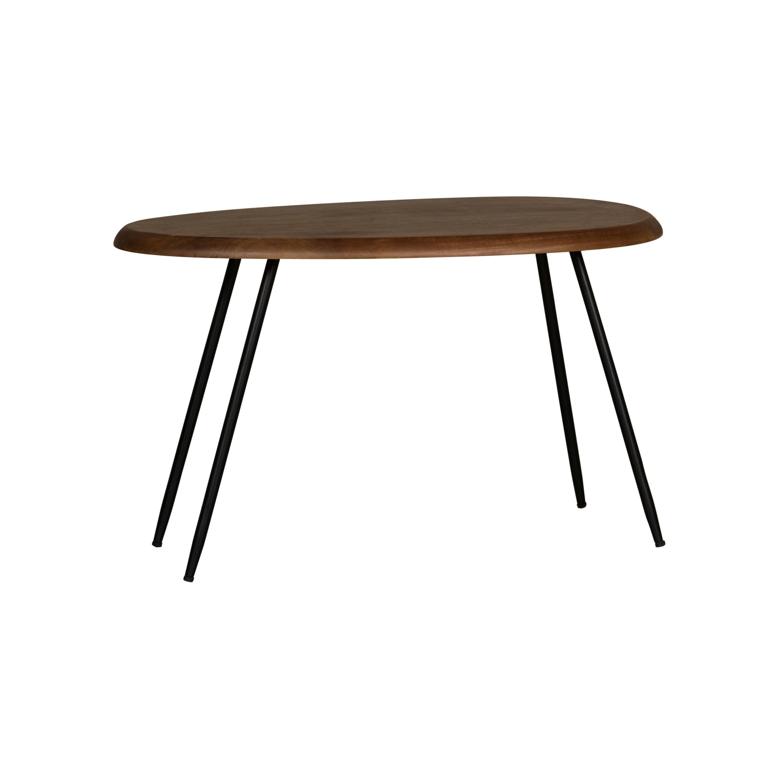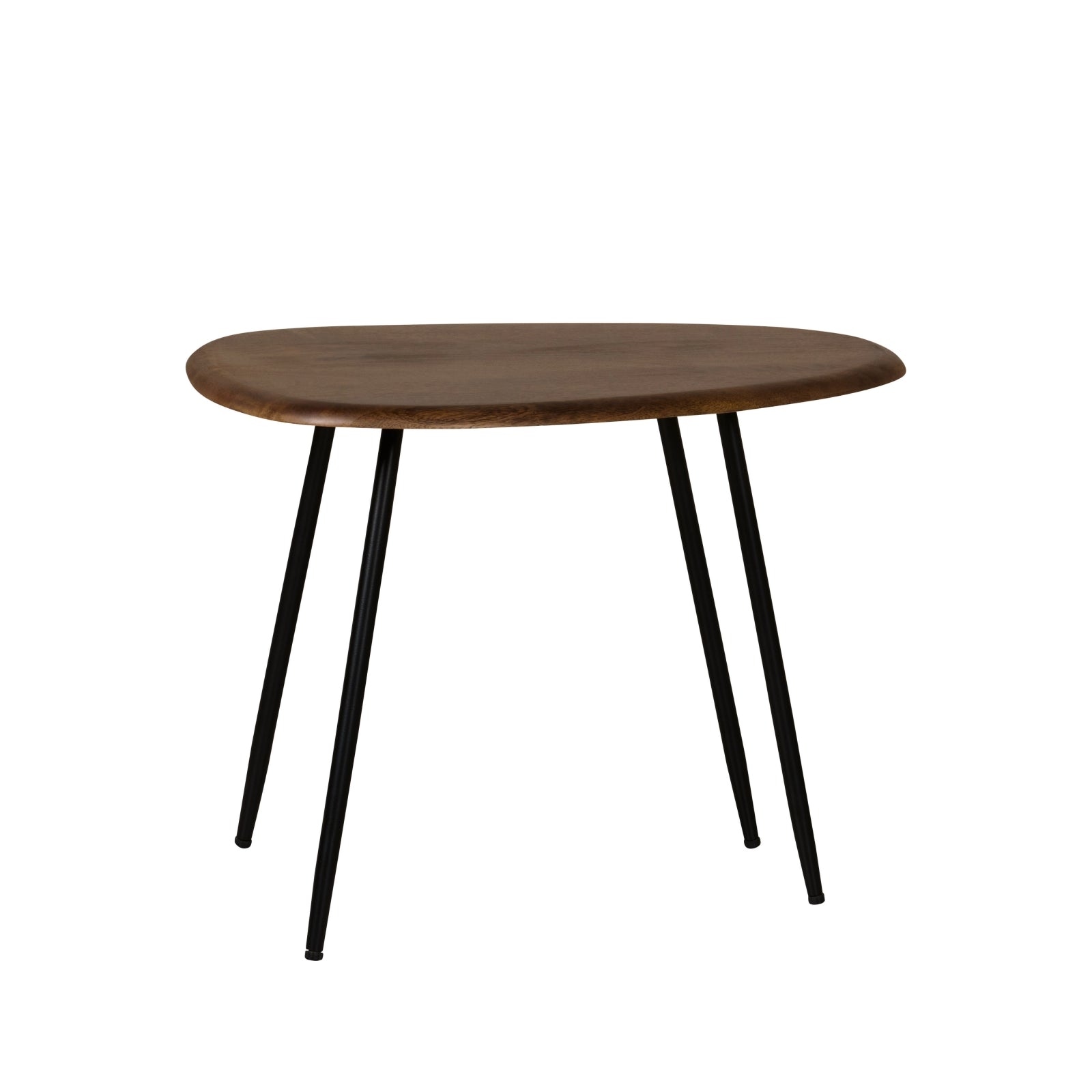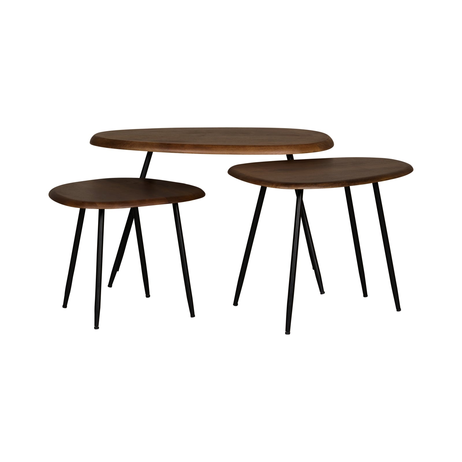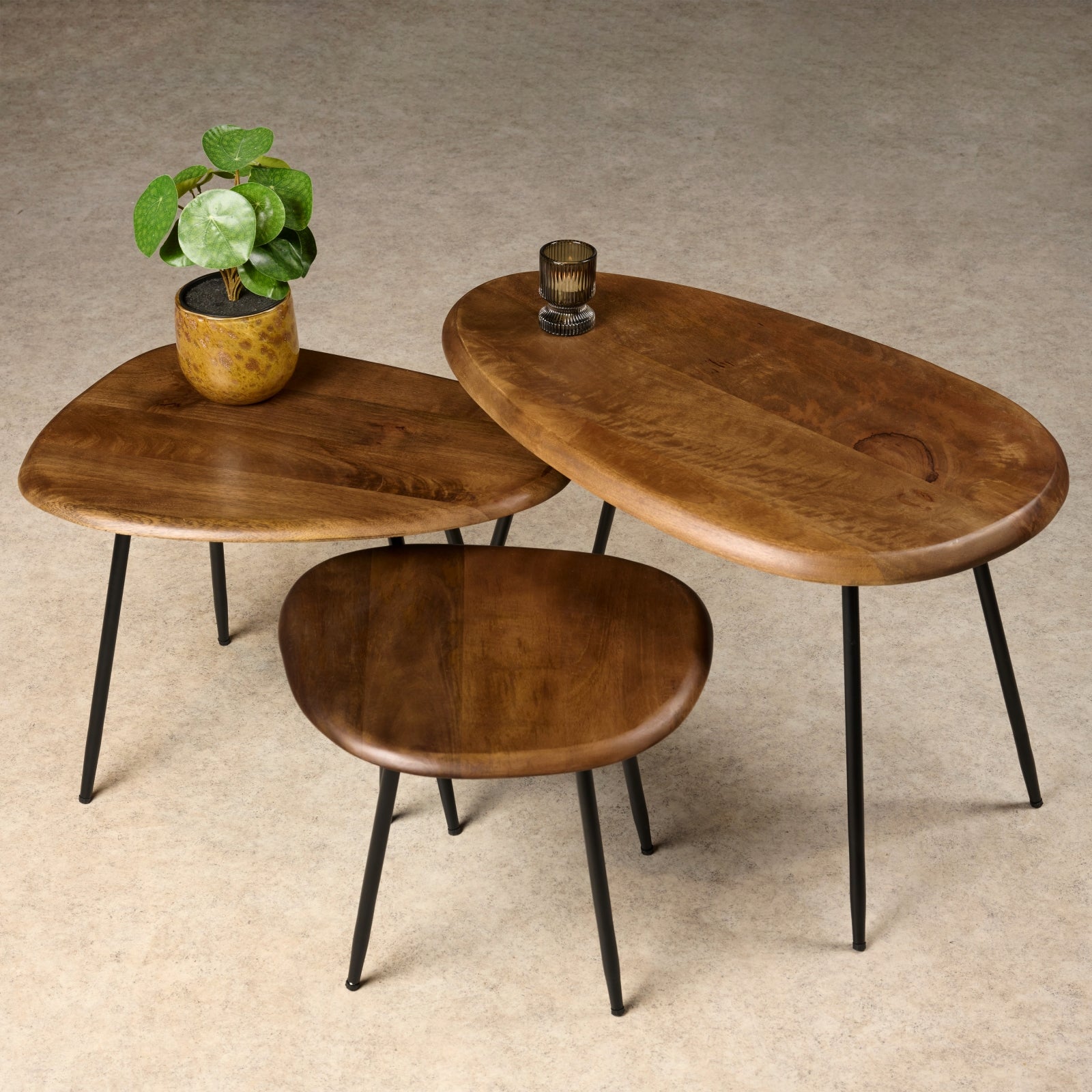 De sfeer is heerlijk luchtig en minimalistisch, maar met z'n drietjes bij elkaar bieden de Dazio salontafels toch voldoende ruimte. Er is genoeg plek voor drankjes, hapjes en wat gezellige decoratie. Natuurlijk hoef je ze niet allemaal gegroepeerd te plaatsen. Ook afzonderlijk komen deze organisch gevormde salontafels heel goed tot hun recht. Wees vooral lekker speels! Belangrijk om te weten: De grootste tafel is 73x42 cm en is 45 cm hoog. De medium maat is 55x40 cm en 39 cm hoog. De kleinste tafel is 37x41 cm en 35 cm hoog. De bladen zijn van mangohout in een warme kleur, met een mat gelakte afwerking. De ranke poten zijn van zwart metaal en deze moeten nog gemonteerd worden.