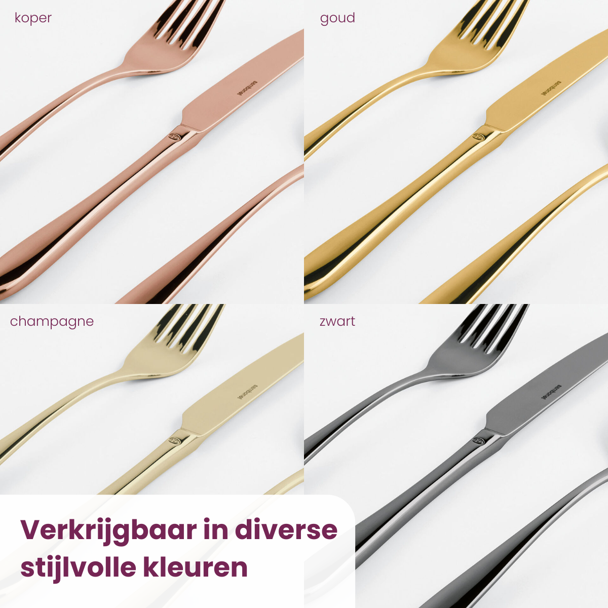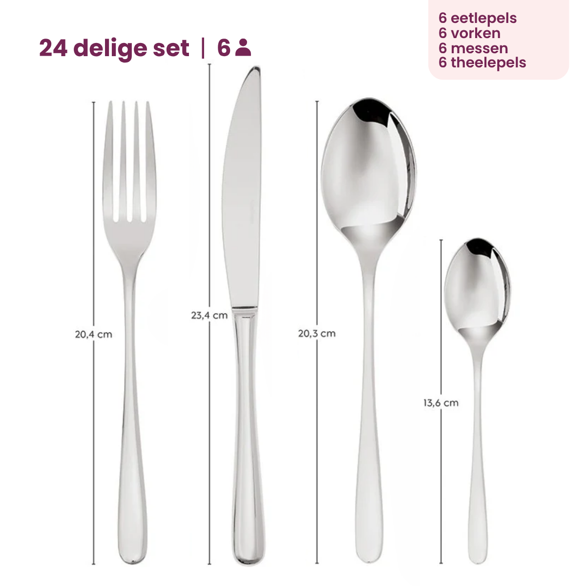 Deze bestekset bestaat uit: 6 messen 6 vorken 6 lepels 6 koffielepels Het bestekset heeft een prachtig design en is passend op iedere gedekte tafel! Prachtig glimmend liggen ze op tafel en brengen ze het diner naar een hoger niveau! Gelieve deze bestekset met de hand te reinigen. De agressieve bestandsdelen in de vaatwasblokjes kunnen het bestek aantasten wat natuurlijk eeuwig zonde is. Dit is een bestek om jarenlang van en mee te genieten!