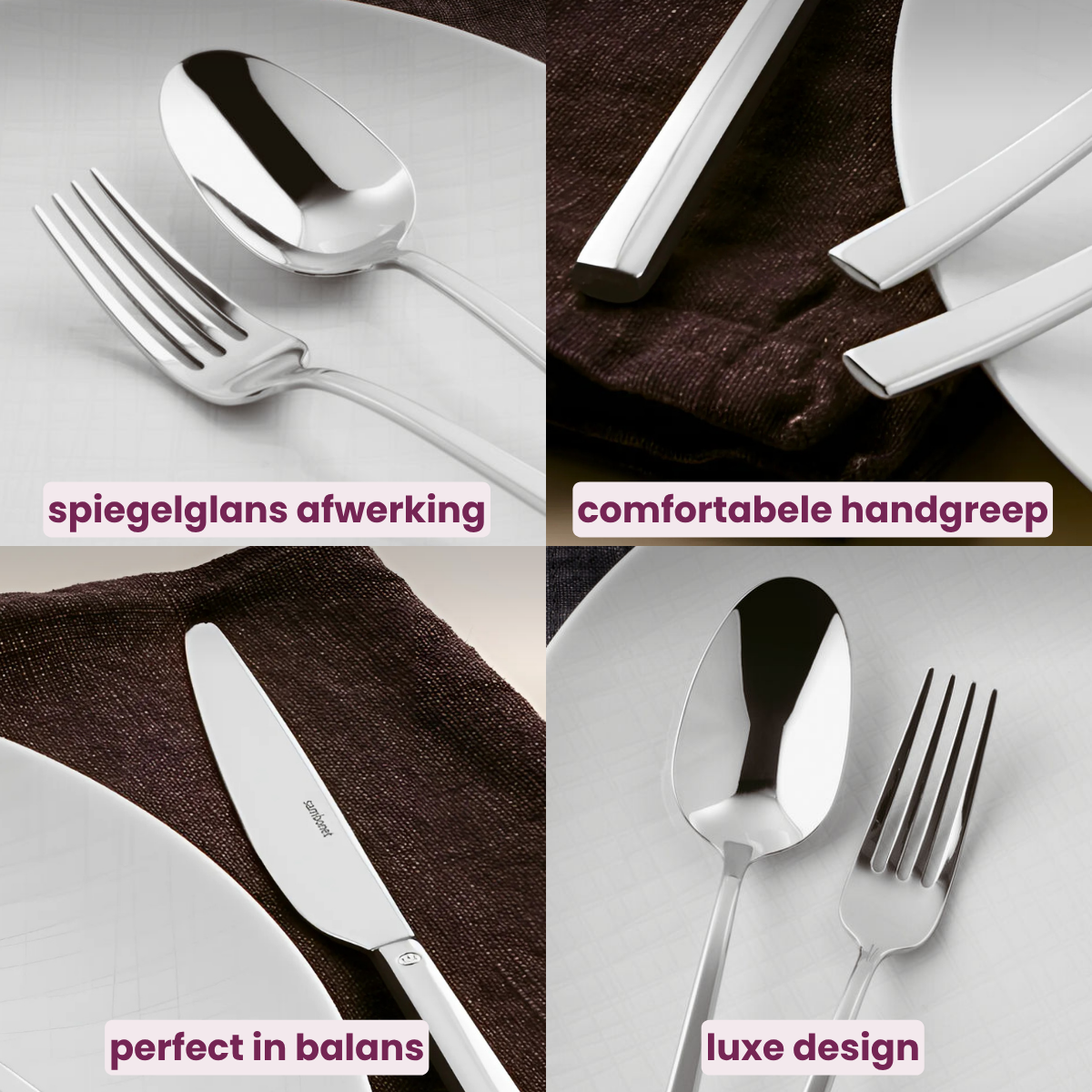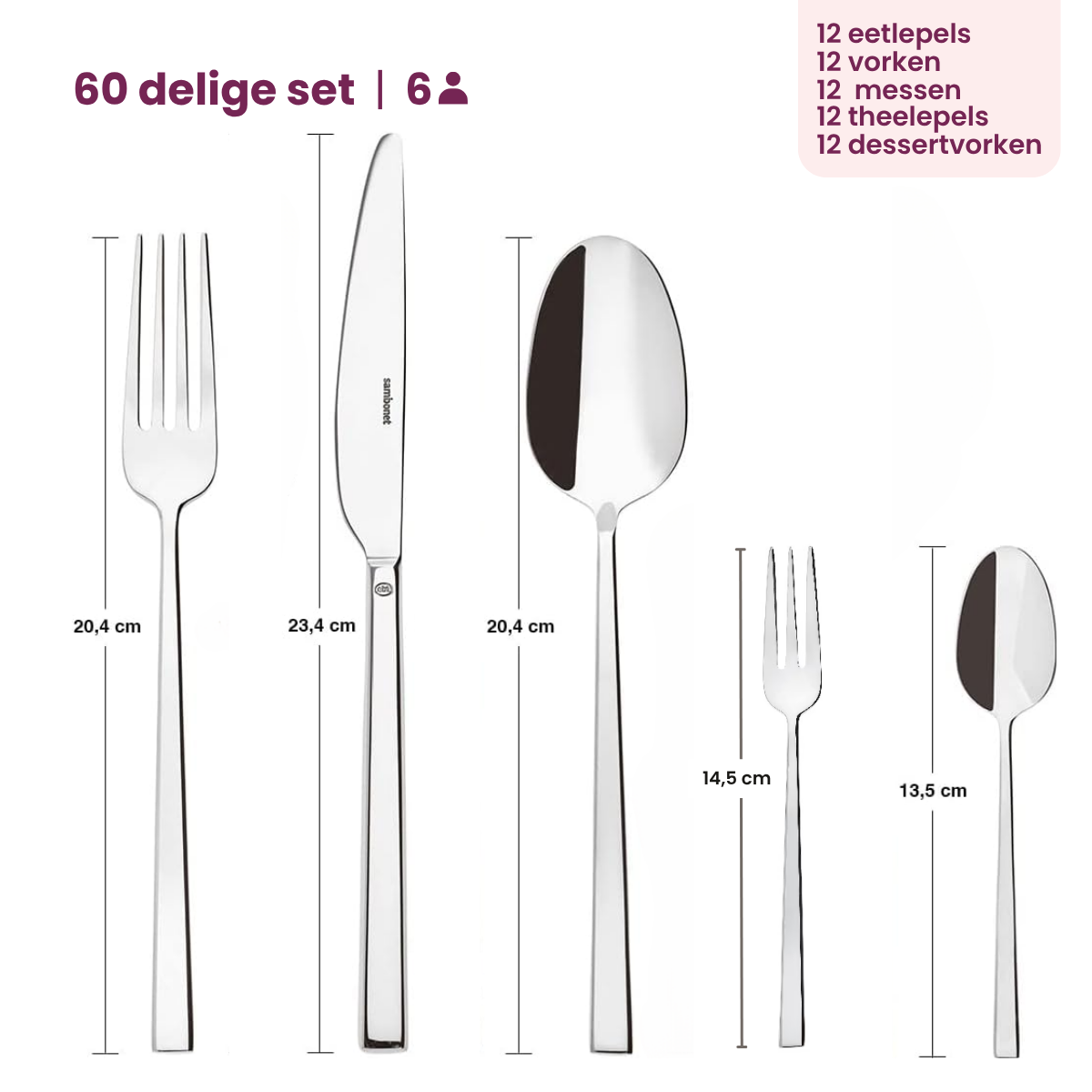 Met dit 60-delige bestek van Sambonet ben jij helemaal klaar om te eten met 12 personen! De Rock bestekset van Sambonet komt in meerdere kleuren, is tijdloos en straalt luxe uit. Kies voor zilver, zwart, koper of goud en geniet met familie en vrienden van een heerlijk diner. Dankzij de PVD-coating is het bestek bestand tegen krassen en kan het in de vaatwasser.