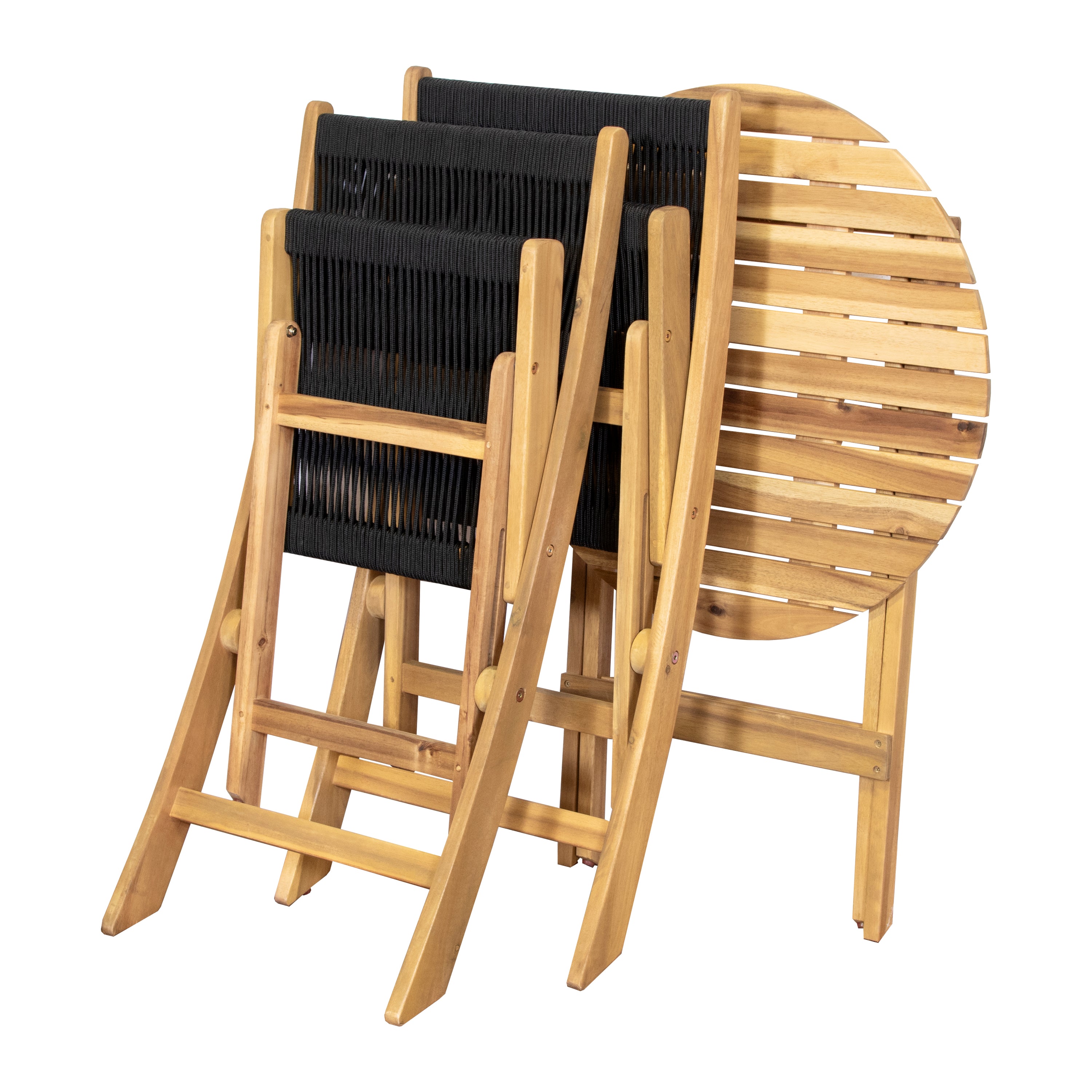 Stoel: H 80 x B 42,5 x D 51 cmTafel: H 69,5 x B 60 x D 60 cmBehandel je houten tuinmeubels altijd één à twee keer per jaar met een houtolie