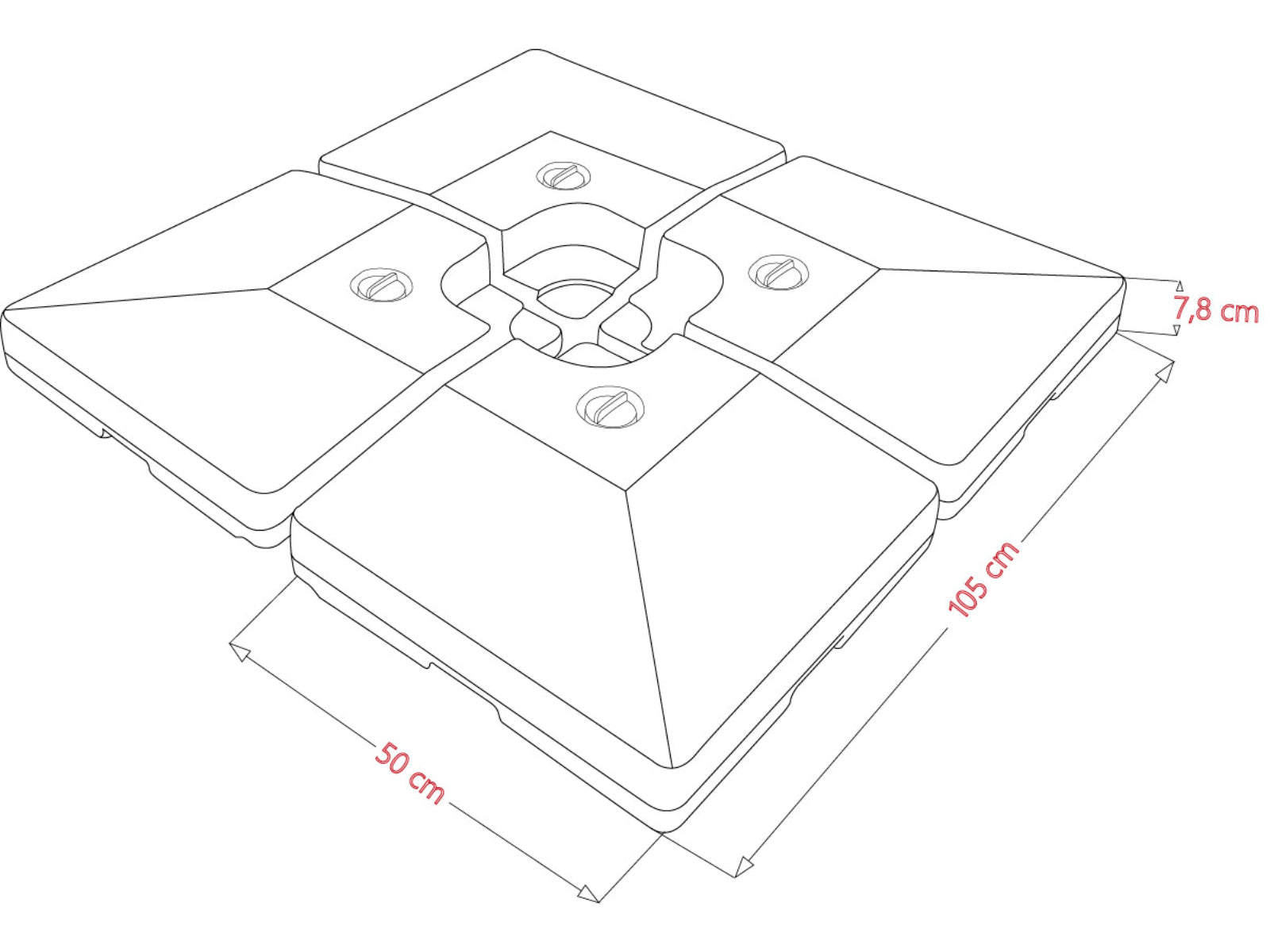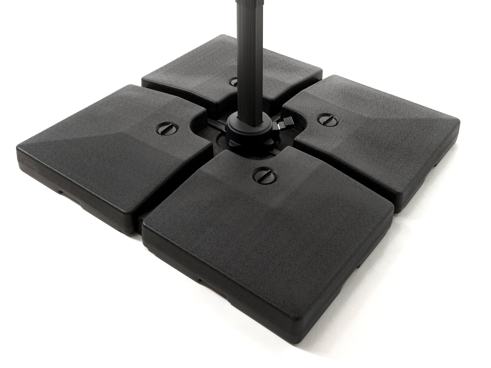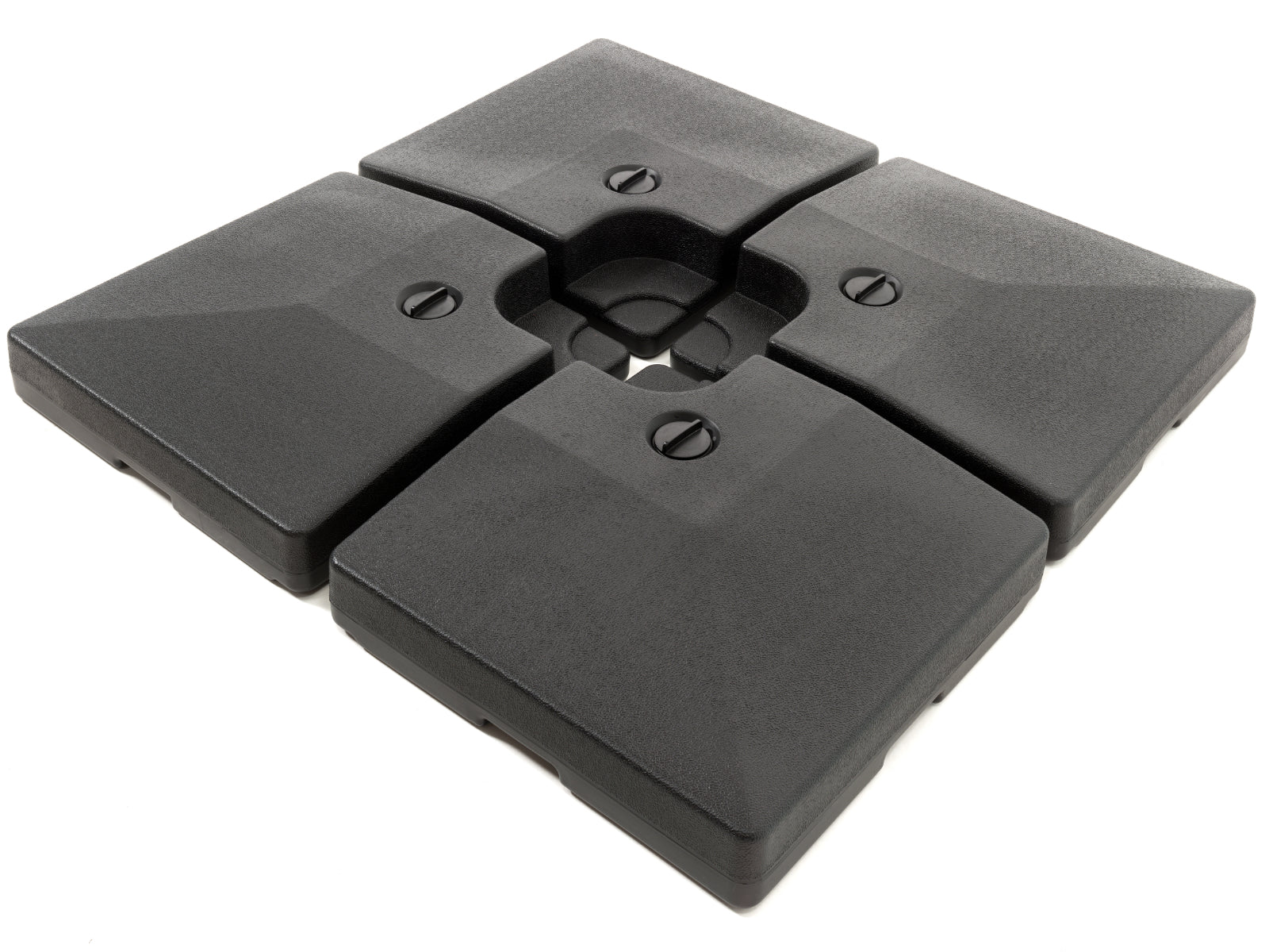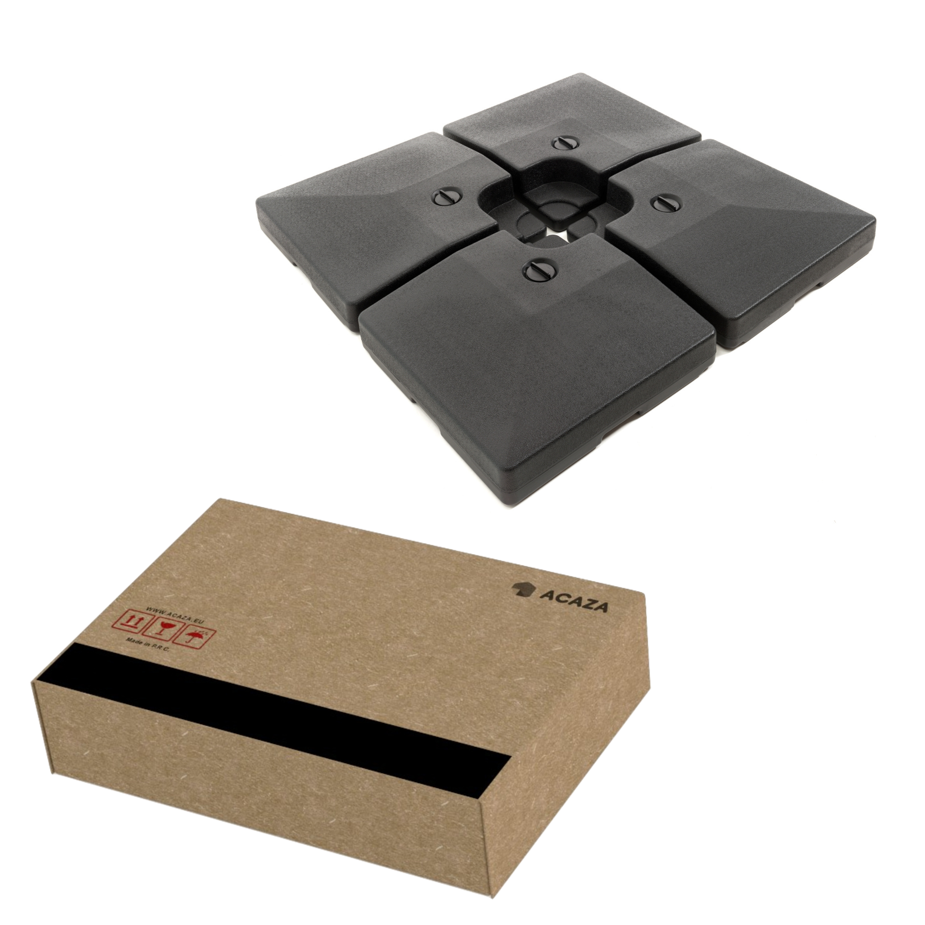 Met deze parasolvoet van ACAZA blijft jouw parasol stevig rechtop staan. Vul de 4 onderdelen met water en creëer zo een voet tot wel 80 kg. Als de winter er aankomt, kan je het water weg laten vloeien. De parasolvoet is dan licht en gemakkelijk op te bergen.Deze parasolvoet is compatibel met de meeste kruisvoeten van zweefparasollen, zoals de ACAZA zweefparasol.Specificaties:- Kleur: Zwart- Afmetingen: 105 Breed x 105 cm Diep x 7 cm HoogWat u krijgt: - 1 Parasol Voet bestaande uit 4 parasol tegels