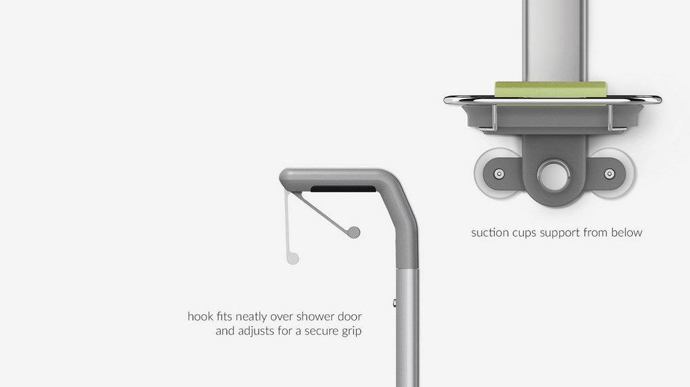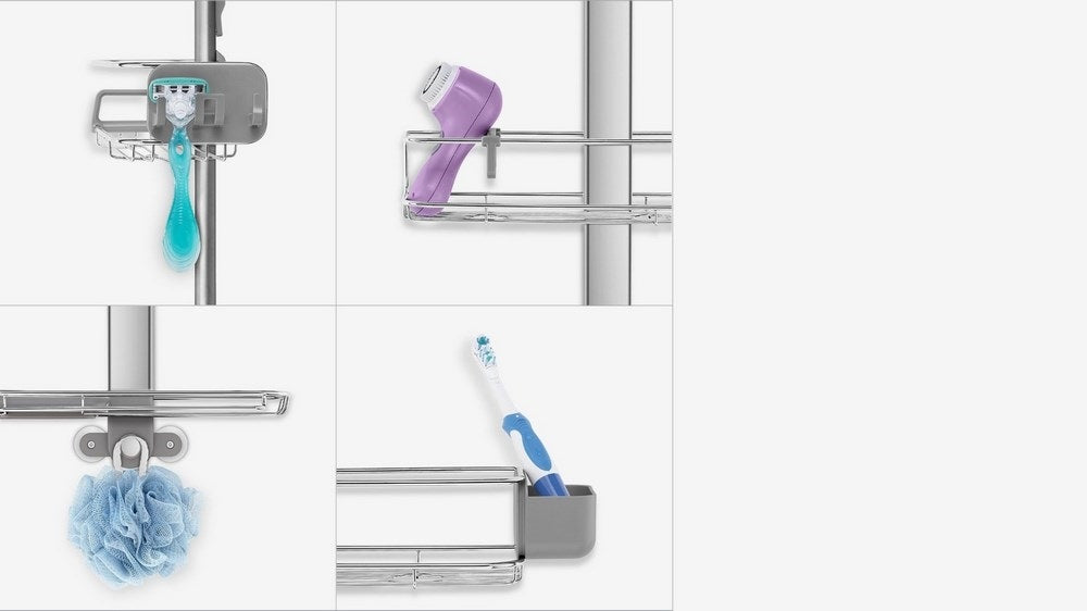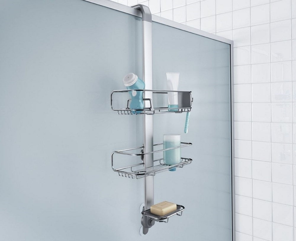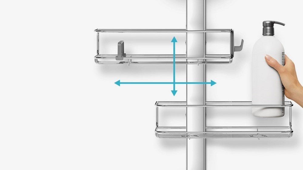 Makkelijk in gebruik De Showercaddy van Simplehuman hang je gemakkelijk aan de douchewand. Vervolgens druk je de onderkant vast met zuignappen: zo zit hij stevig vast aan de wand. Op de onderste plank is genoeg plek voor flessen douchegel en shampoo, perfect voor jou en je liefje met allebei een eigen voorkeur aan doucheproducten. De bovenste plank heeft een verstelbare verdeler. Het duurzame, stevige RVS is bovendien roestbestendig en is makkelijk te onderhouden. De Showercaddy is de chique oplossing voor een rommelige douchecabine!