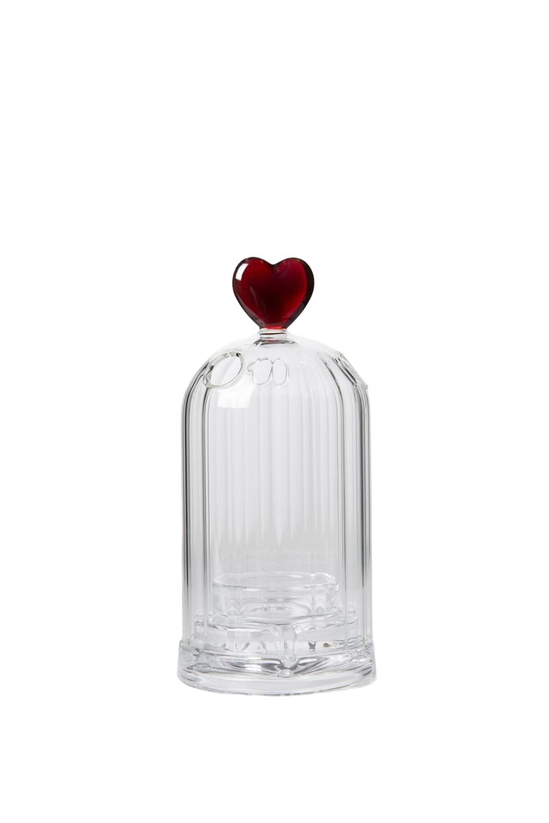 Glazen waxinelichthouder met hart van Sissy-Boy. De waxinelichthouder heeft een stolpvorm en een romantisch rood hart aan de bovenkant. Afmeting: 14,5 x 7,5 cm. Materiaal: 100% glas.