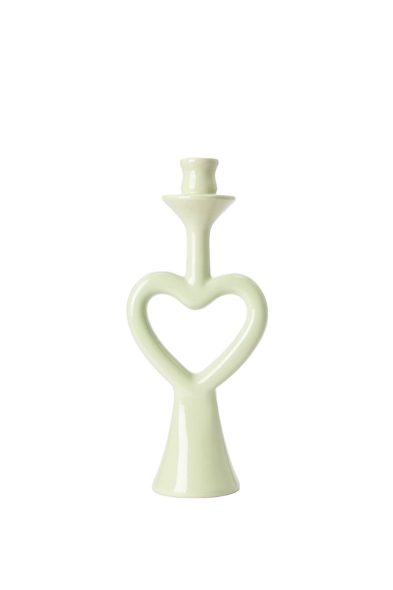 Lichtgroene kandelaar met open hart van Sissy-Boy. De kandelaar is gemaakt van keramiek in de vorm van een hart. Afmeting: 12.5 x 7.5 x 29 cm.