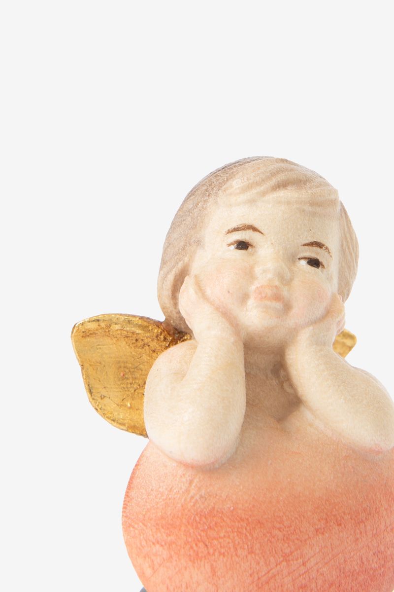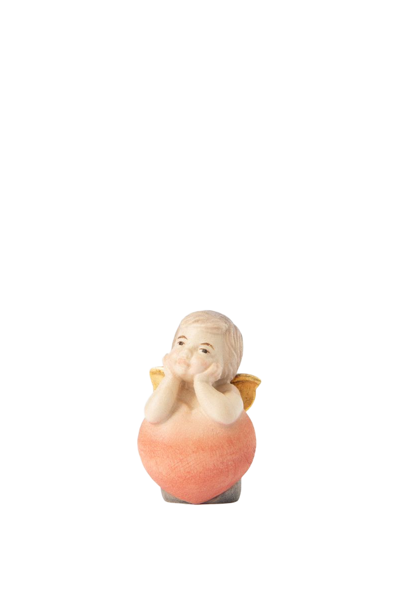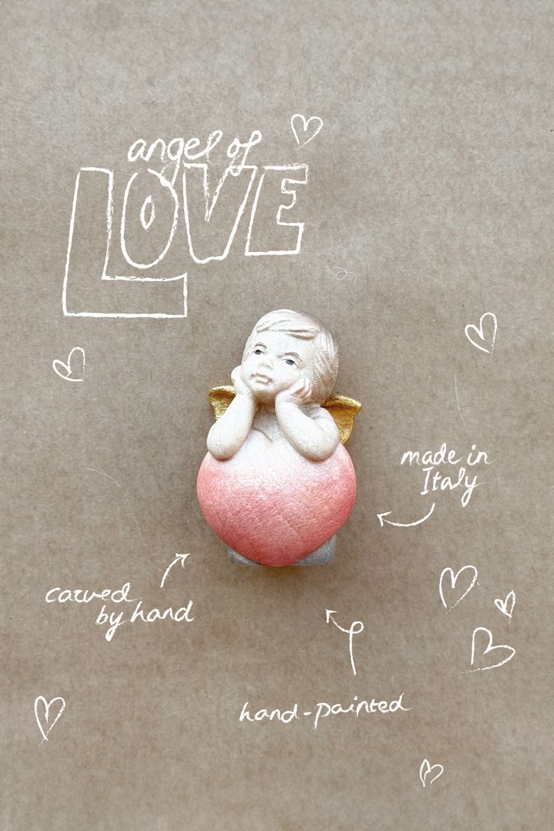 Roze houten kerstengel met hart van Sissy-Boy. De kerstengel heeft goudkleurige vleugels en leunt tegen een groot roze hart aan. Dit engeltje is volledig met de hand gesneden en beschilderd in Italië. Het engeltje staat symbool voor liefde en is een van de meest pure gebaren om persoonlijk aan iemand te geven die het een extra beetje nodig heeft. Afmeting: 5,7 cm. Materiaal: 100% hout.