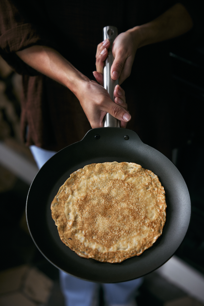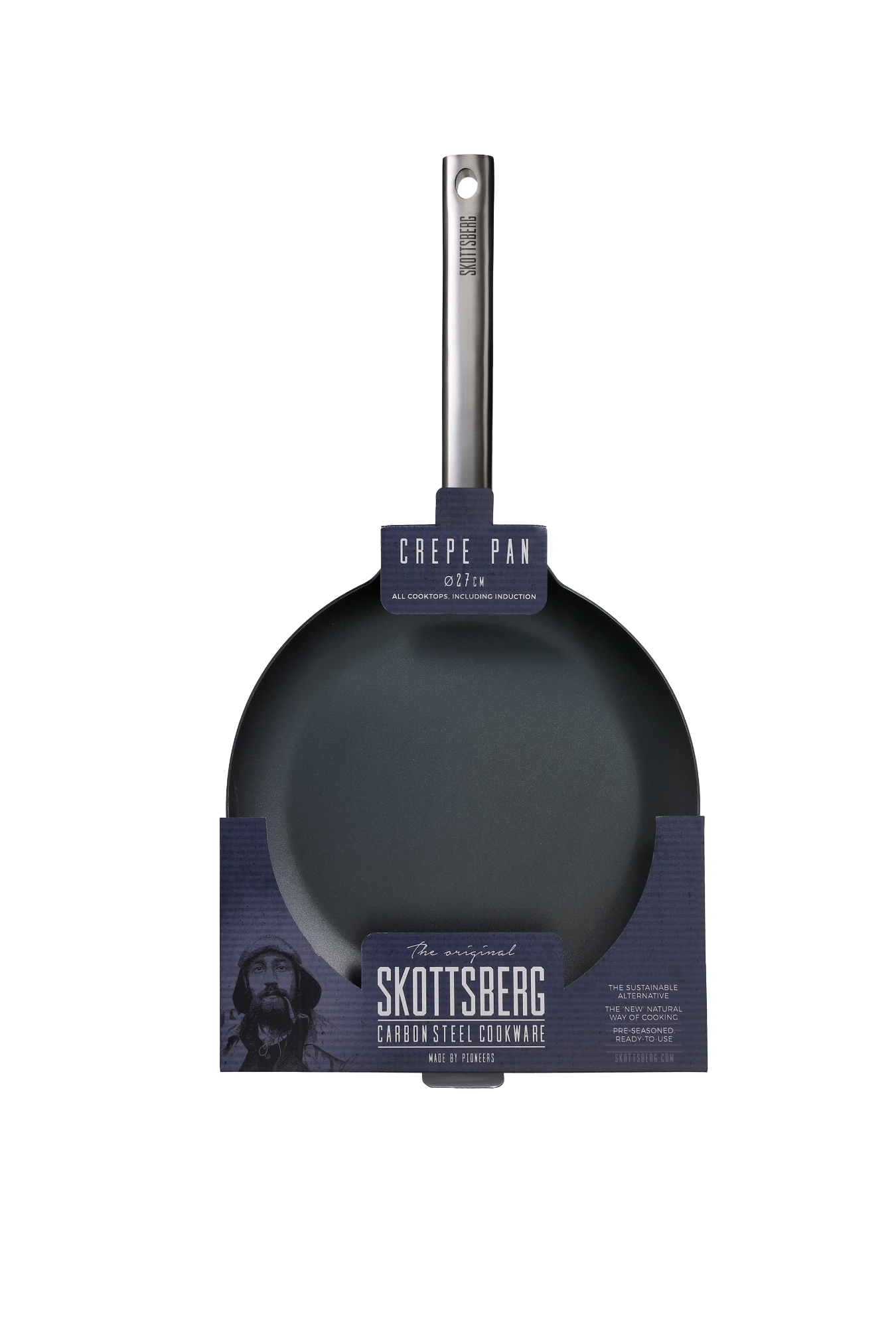 De Skottsberg Carbon Steel pannenkoekenpan heeft de look van een antiaanbaklaag en wordt gewaardeerd om een aantal bijzondere eigenschappen. De pannenkoekenpan is pre-seasoned, dat wil zeggen; de pan is 2 keer ingebrand met plantaardige olie en reageert als een antiaanbakpan. Daarnaast heeft de bodem van de pan de perfecte dikte (2,5 mm) om te voorkomen dat de bodem van de pan kromtrekt op inductie. De steel van deze pannenkoekenpan is hol en neemt de hitte van de pan niet over.