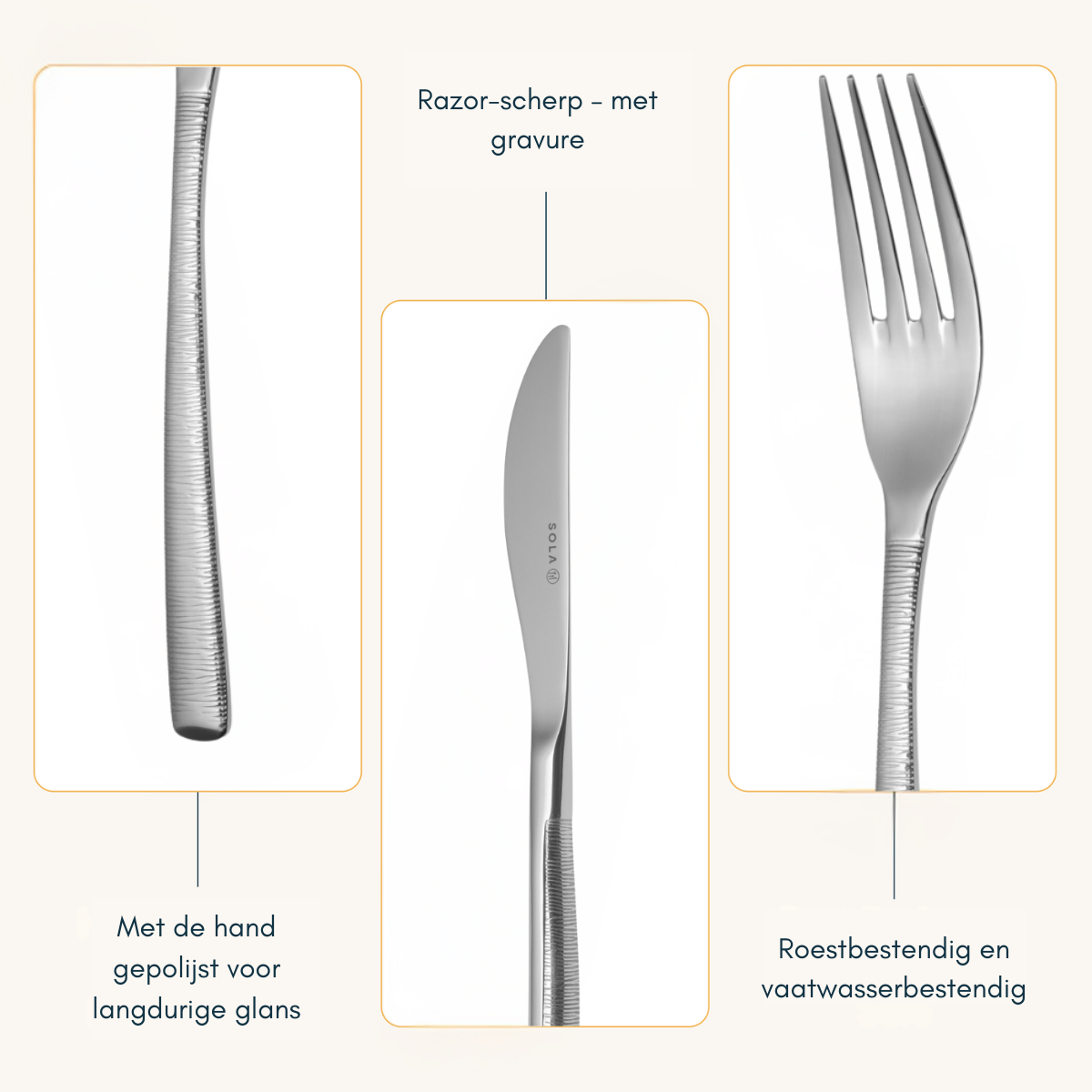 De Sola Hermitage besteklijn is niet alleen stijlvol, maar ook praktisch, omdat het vaatwasserbestendig is en bestand tegen intensief gebruik. Een uitstekende keuze voor wie houdt van elegantie en functionaliteit in één. Met de Hermitage collectie creëer je een verfijnde en uitnodigende tafel voor elke gelegenheid.