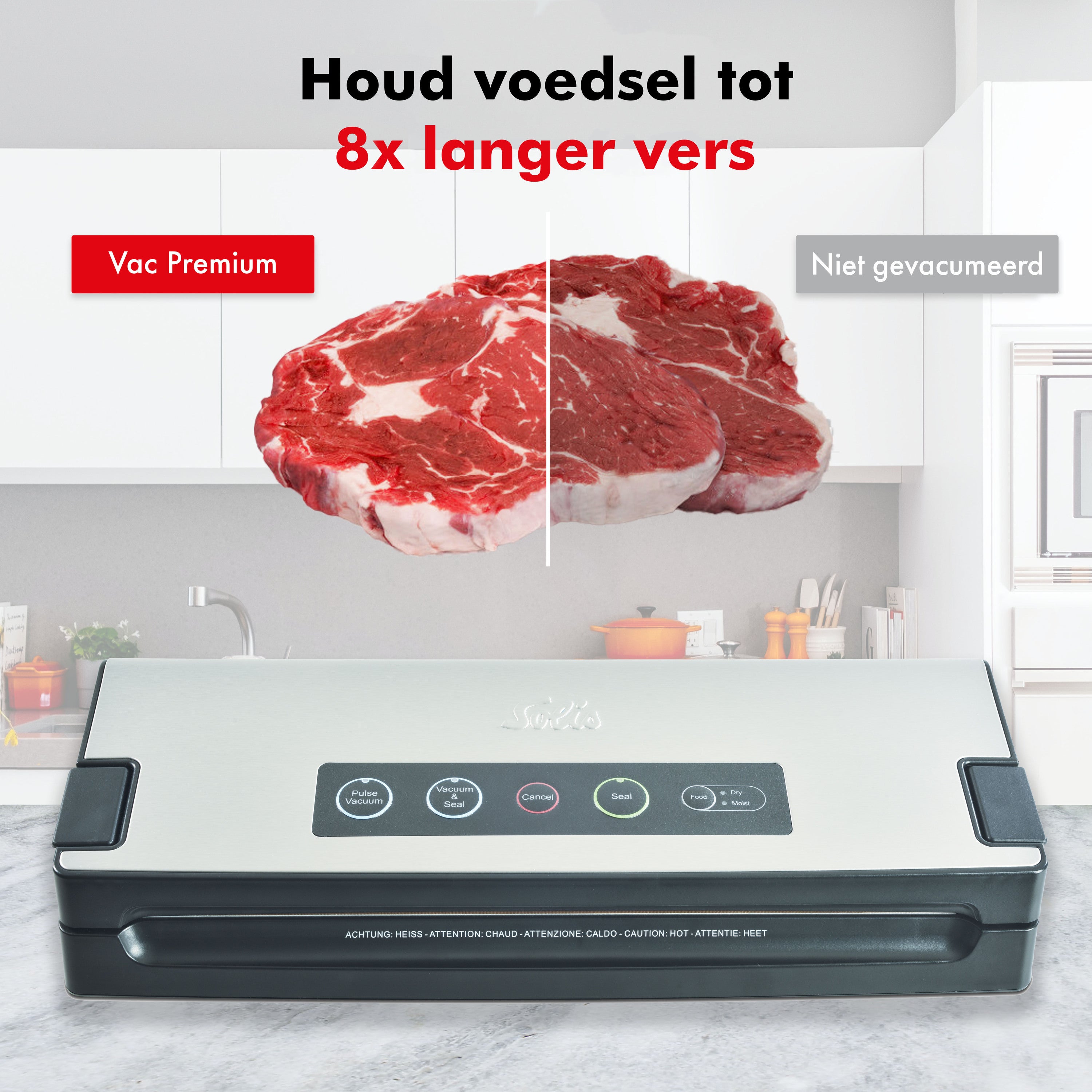 - INHOUD - Solis Vac Premium 574 vacumeermachine, inclusief vacumeerslang en 2 vacuümrollen (20 x 600 cm) en 50 vacuümzakken (20 x 30 cm)