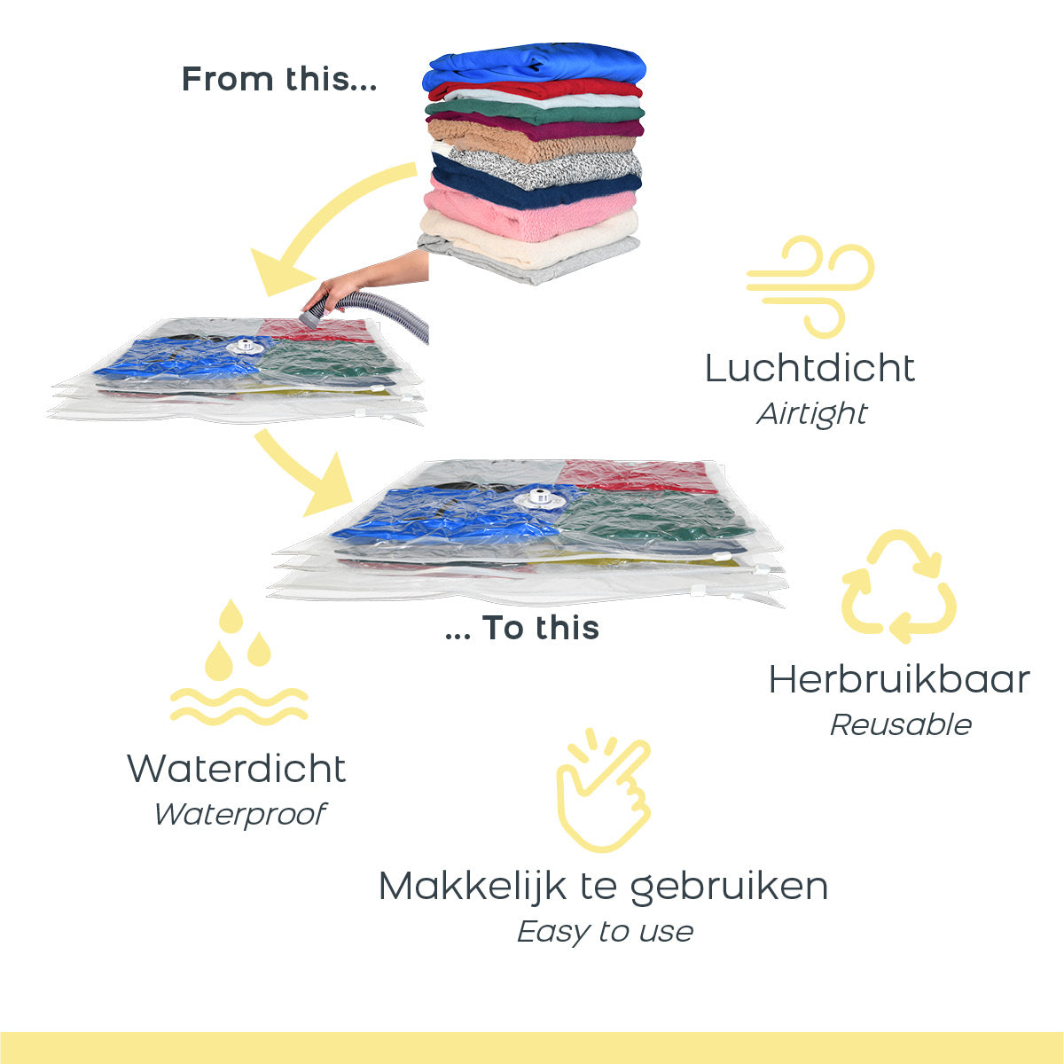 Zeg vaarwel tegen uitpuilende kasten en hallo tegen een opgeruimd en georganiseerd leven met de Space Buddy Vacuüm Storage Bags. Ervaar het gemak van extra opbergruimte en bescherm tegelijkertijd je waardevolle spullen. Verpakkingsinhoud 7-delige set:
