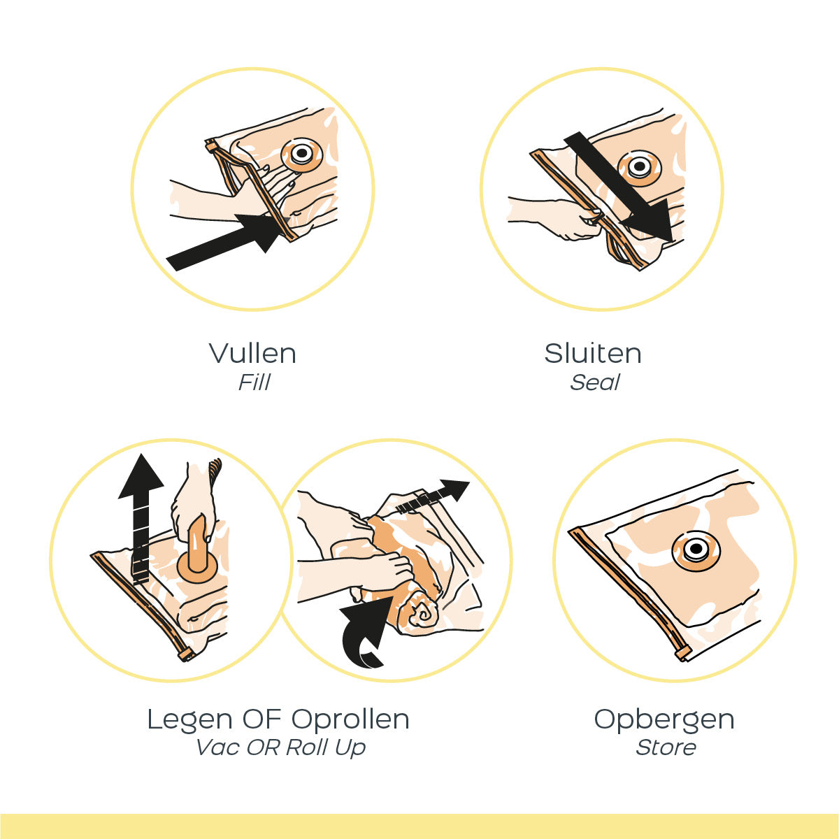 De set bevat zeven opbergzakken van verschillende grootte om aan al je opslagbehoeften te voldoen. De reeks zorgt ervoor dat je voor elk item de perfecte tas hebt, van kleine accessoires tot grotere kledingstukken of omvangrijk beddengoed. De tassen zijn ook herbruikbaar, waardoor ze een milieuvriendelijke keuze zijn. Bovendien is het gebruik van de Space Buddy Vacuüm Storage Bags supereenvoudig. Plaats je spullen erin, sluit de sluiting en gebruik het mondstuk van de stofzuiger om de lucht door het ventiel weg te zuigen of rol de zak op om de overtollige lucht te verwijderen. De opbergzak comprimeert en bespaart tot 3x de opslagruimte.