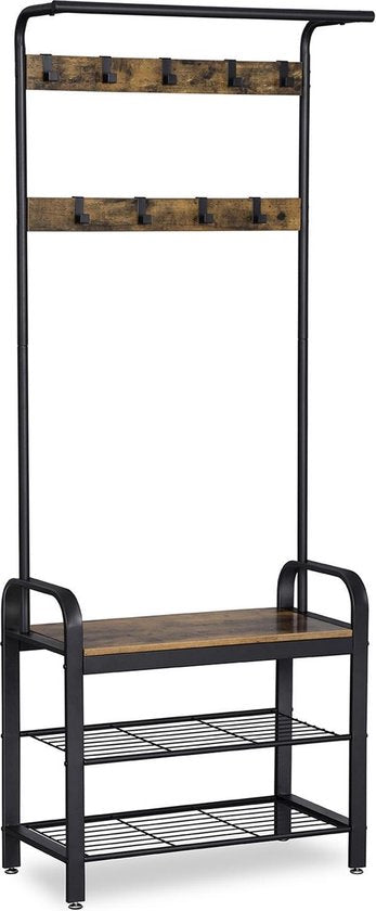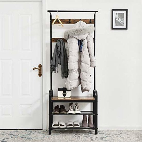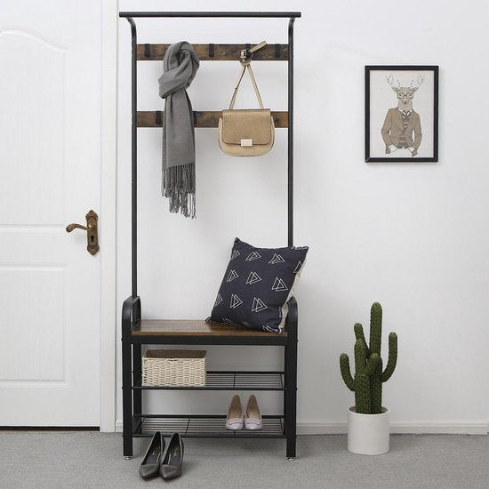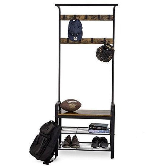 Een plek voor uw schoenen: Deze hoed en kapstok heeft niet alleen negen stevige haken en een kledingstang aan de bovenkant, maar biedt ook twee metalen draadplanken voor schoenen en een stevige bank waarop u uw schoenen op comfortabele wijze aan kunt trekken.