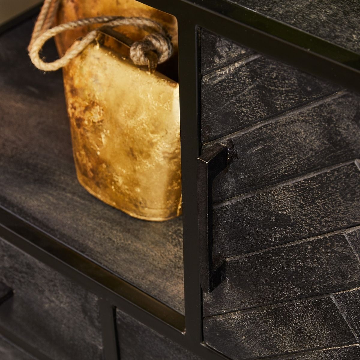 - De vakkenkast beschikt over vier lades, vier deuren en twee open vakken waarin je al jouw spullen en accessoires kan bewaren