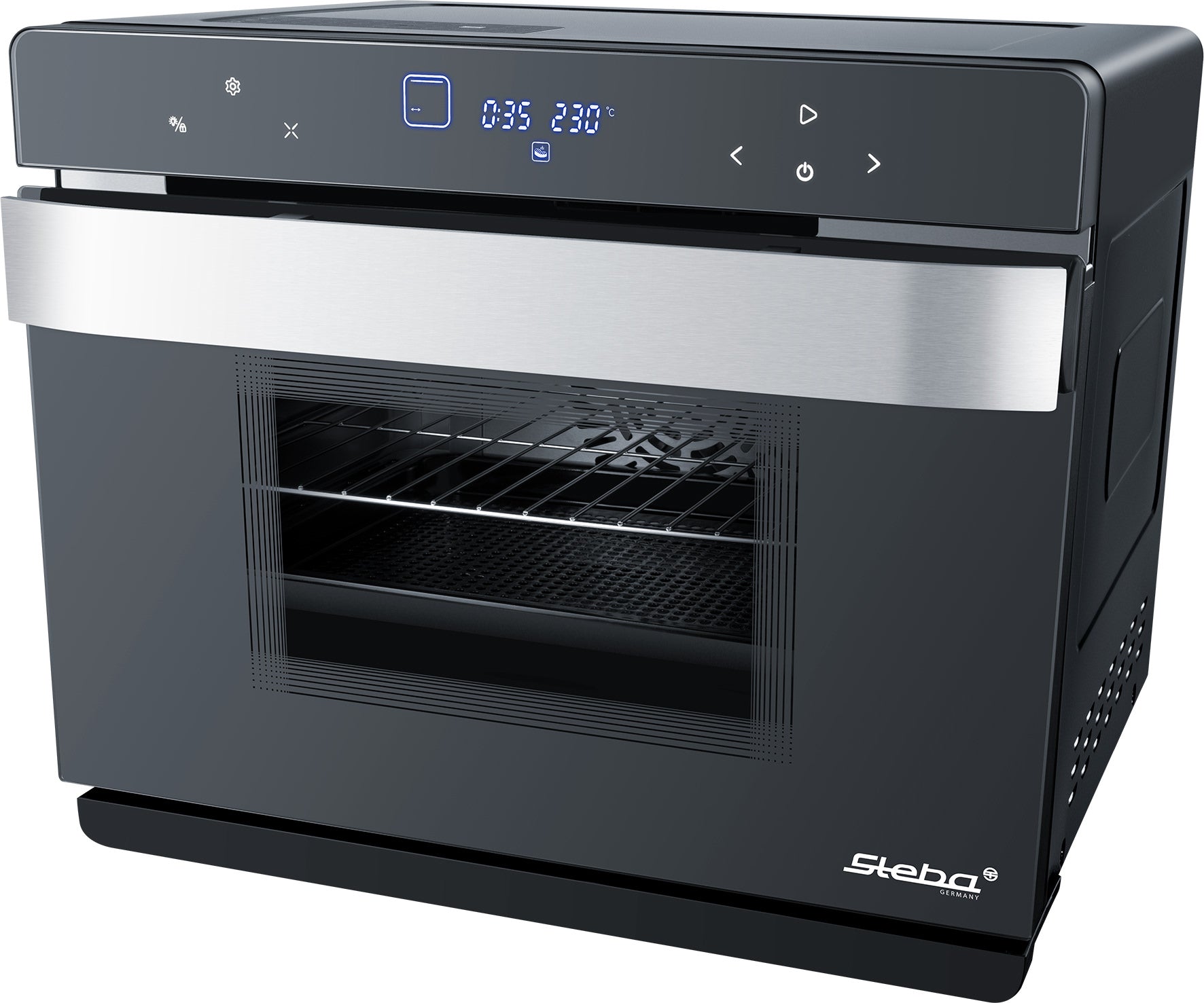 Multifunctionele stoom bakoven van 40 liter van het merk Steba. Deze oven heeft een speciale stoom functie om zo het voedsel met stoom te bereiden in plaats van alleen hete lucht. De oven heeft 49 automatische programma’s voor bakken, drogen en stomen en heeft een DIY programma. • Bak de oven in met hete stoom om langzaam te koken• Door de effectieve isolatie is er weinig energie verbruik• 49 automatische programma's, b.v. voor bakken, udrogen, stomen• DIY-programma• Rotisserie voor 2 kippen• Bovenste en onderste warmte, hete lucht• Temperatuurregeling tot 230 ° C• 7-uur timer• Interieur verlichting• 4 plank niveaus• 1450 ml watertank• Geëmailleerde bakplaat• Geëmailleerde geperforeerde bak• Kruimellade• Draadgrill• Ca 40l-volume