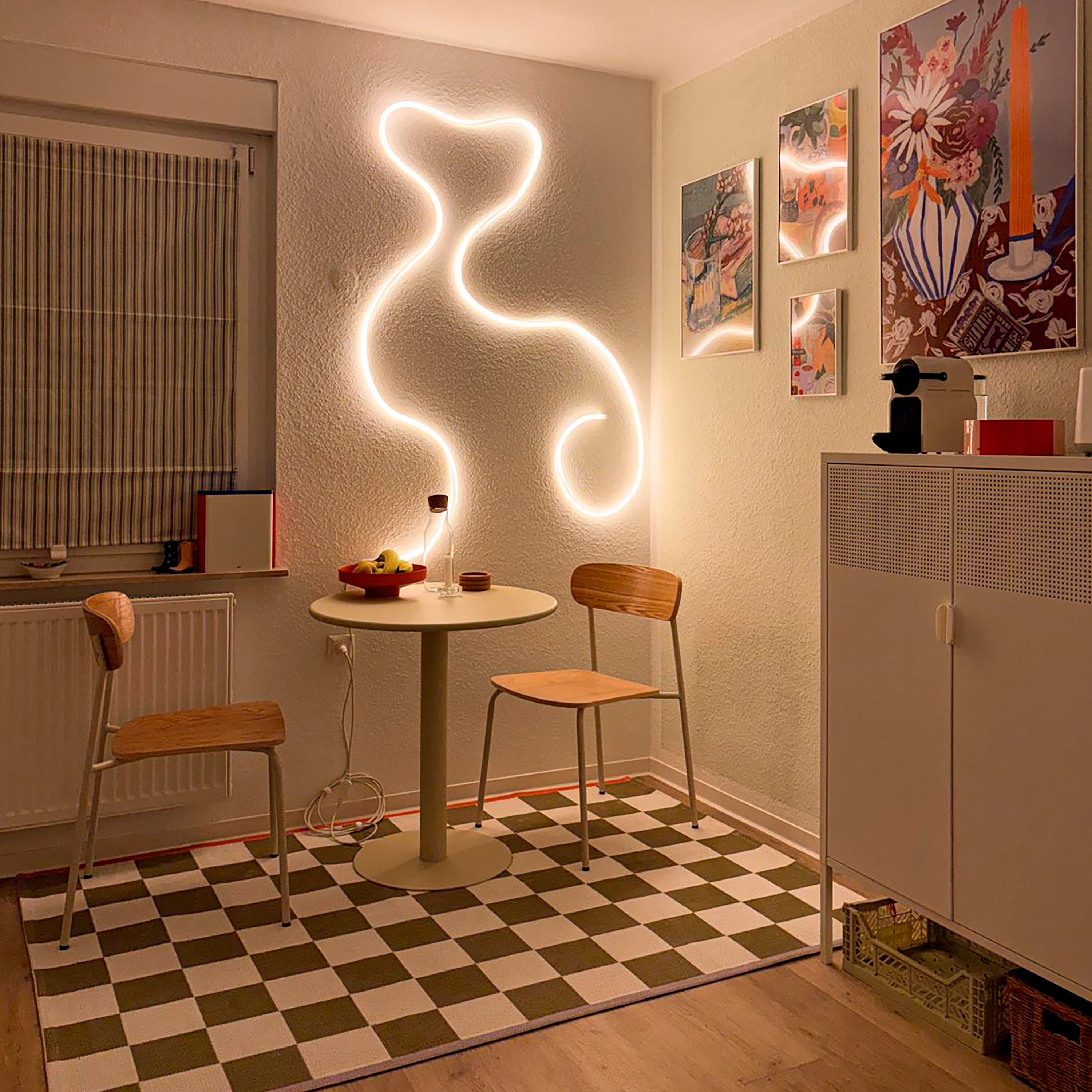 - Hang ‘m aan de muur, leg ‘m op een plank of wikkel ‘m om iets heen