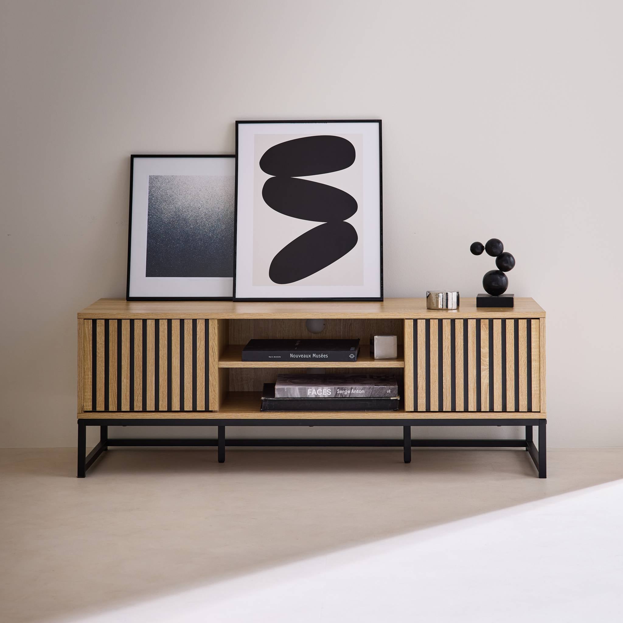 sweeek - 2-deurs TV-meubel in gegroefd hout en zwart metaal L 120