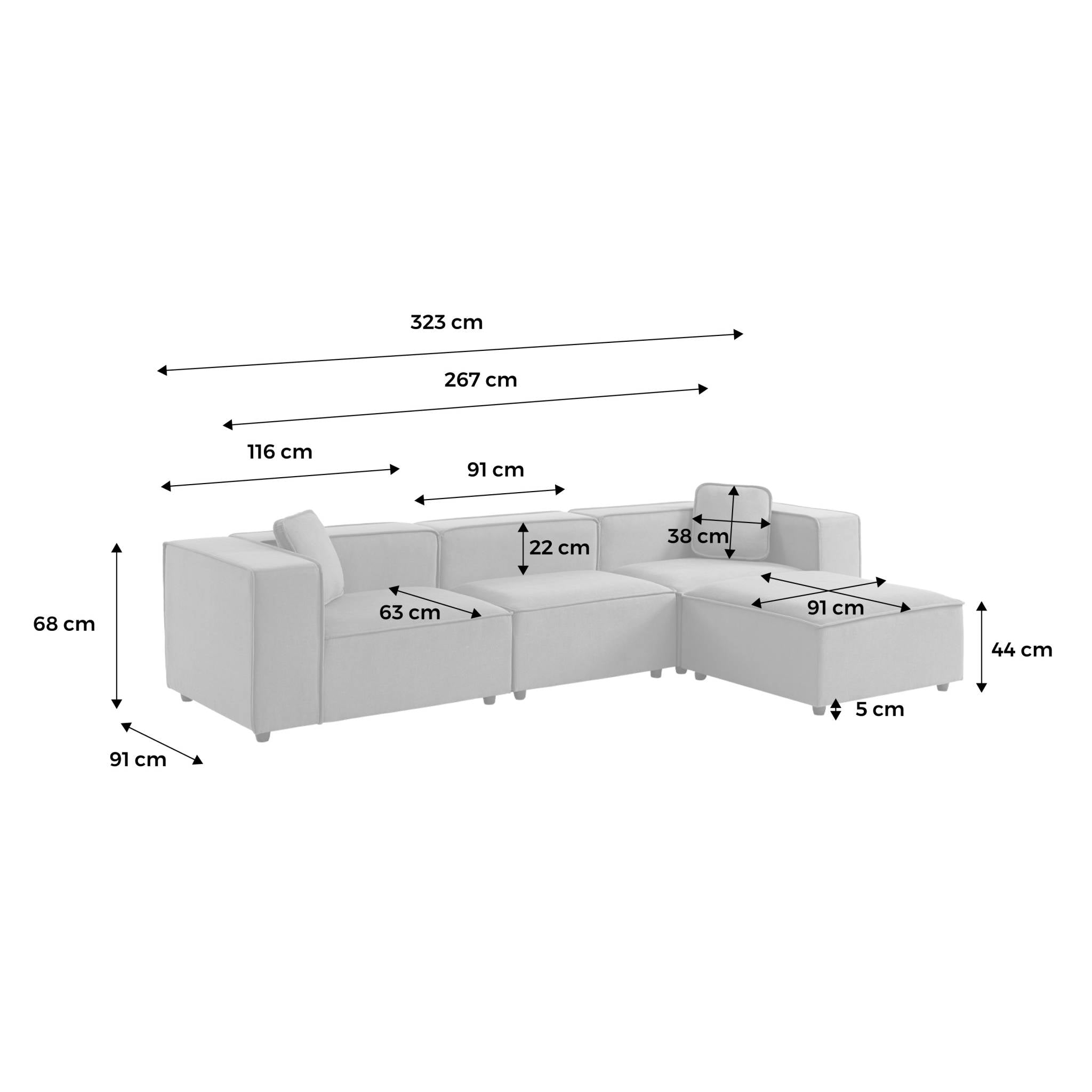 - Modulair: de bank kan worden uitgebreid met Sense poefs