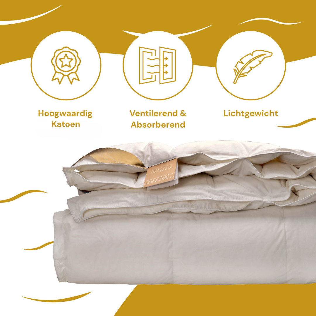 Hoogwaardige tijk Het dekbed is voorzien van een luxe katoenen tijk (NM150), wat zorgt voor een heerlijk zacht gevoel en een uitstekende ventilatie. Dankzij het ademend vermogen blijft het dekbed luchtig en fris, en wordt overtollige warmte afgevoerd. Zo kun je de hele nacht genieten van een aangename temperatuur, zonder dat je het te warm of te koud krijgt.