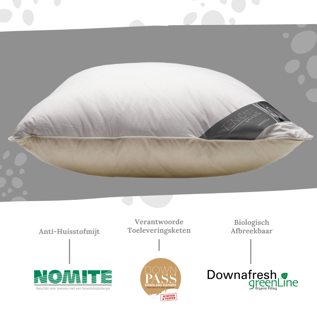 Alle donzen hoofdkussens van Ten Cate beschikken over een drietal labels en/of keurmerken, hiermee wordt de kwaliteit van zowel het hoofdkussen als de verantwoorde toeleveringsketen gewaarborgd. De donzen vulling wordt gewassen volgens de strengste Europese eisen. Daarnaast is het kussen geschikt voor mensen met een huisstofmijtallergie.