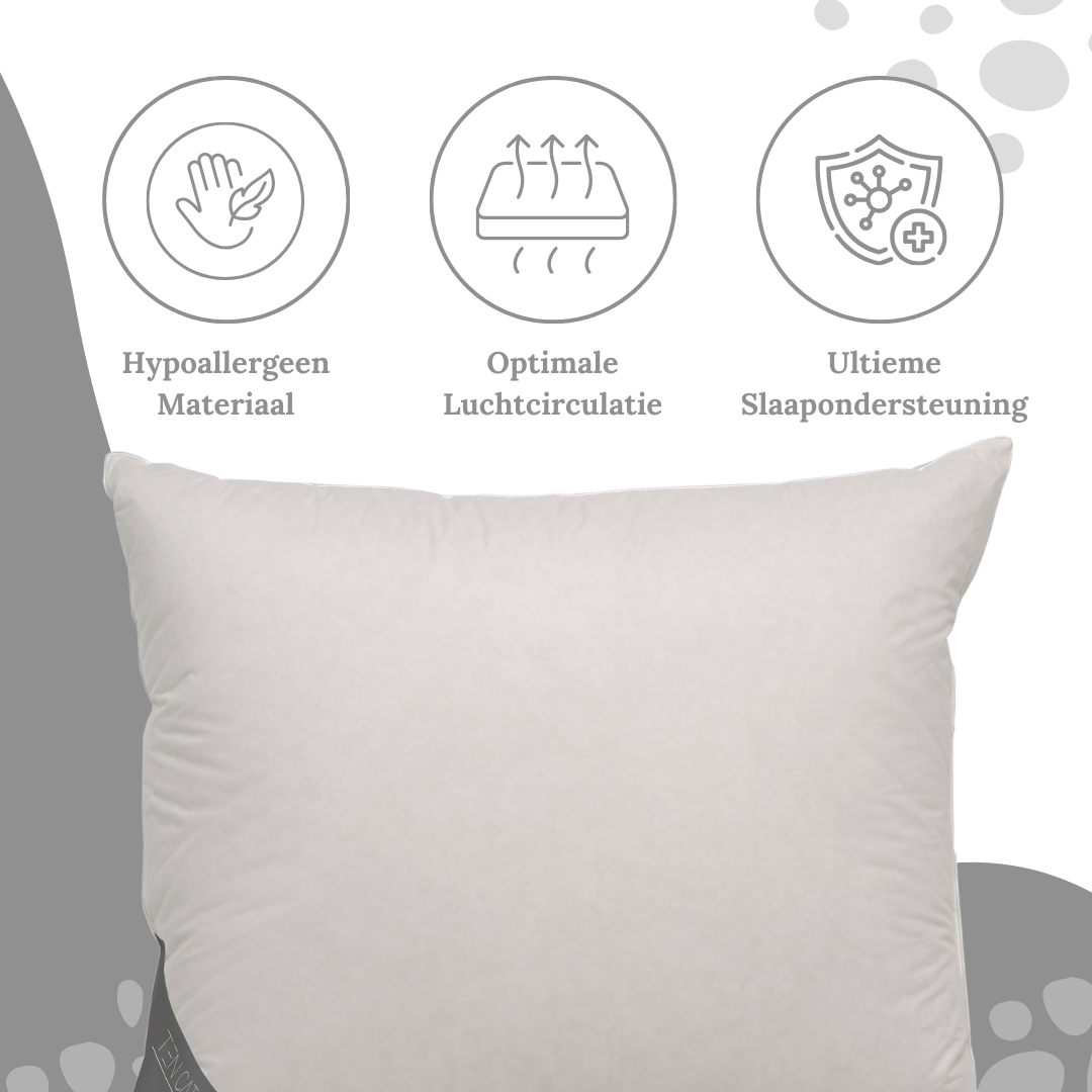 Ontdek nu hét perfecte hoofdkussen voor een goede nachtrust: Het luxe donzen double face hoofdkussen van Ten Cate. Dit unieke kussen onderscheidt zichzelf door haar twee verschillende hardheden. Het kussen bestaat uit twee zijdes: de bovenzijde is gevuld met 200 gram eendendons (90%) en eendenveren (10%), wat zorgt voor een zachte kant. De onderzijde is gevuld met 1000 gram eendendons (15%) en eendenveren (85%) wat zorgt voor een stevige zijde. Hierdoor kun je kiezen op welke zijde je wilt slapen. De vullingen zorgen voor optimale steun en heerlijk comfort tijdens het slapen. Of je nu een buik-, rug-, of zijslaper bent, dit donzen kussen past zich perfect aan jouw slaaphouding aan.. Het eendendons zorgt voor dat heerlijke zachte gevoel, terwijl de eendenveren de juiste stevigheid bieden. Dé perfecte combinatie als je graag in verschillende houdingen slaapt.