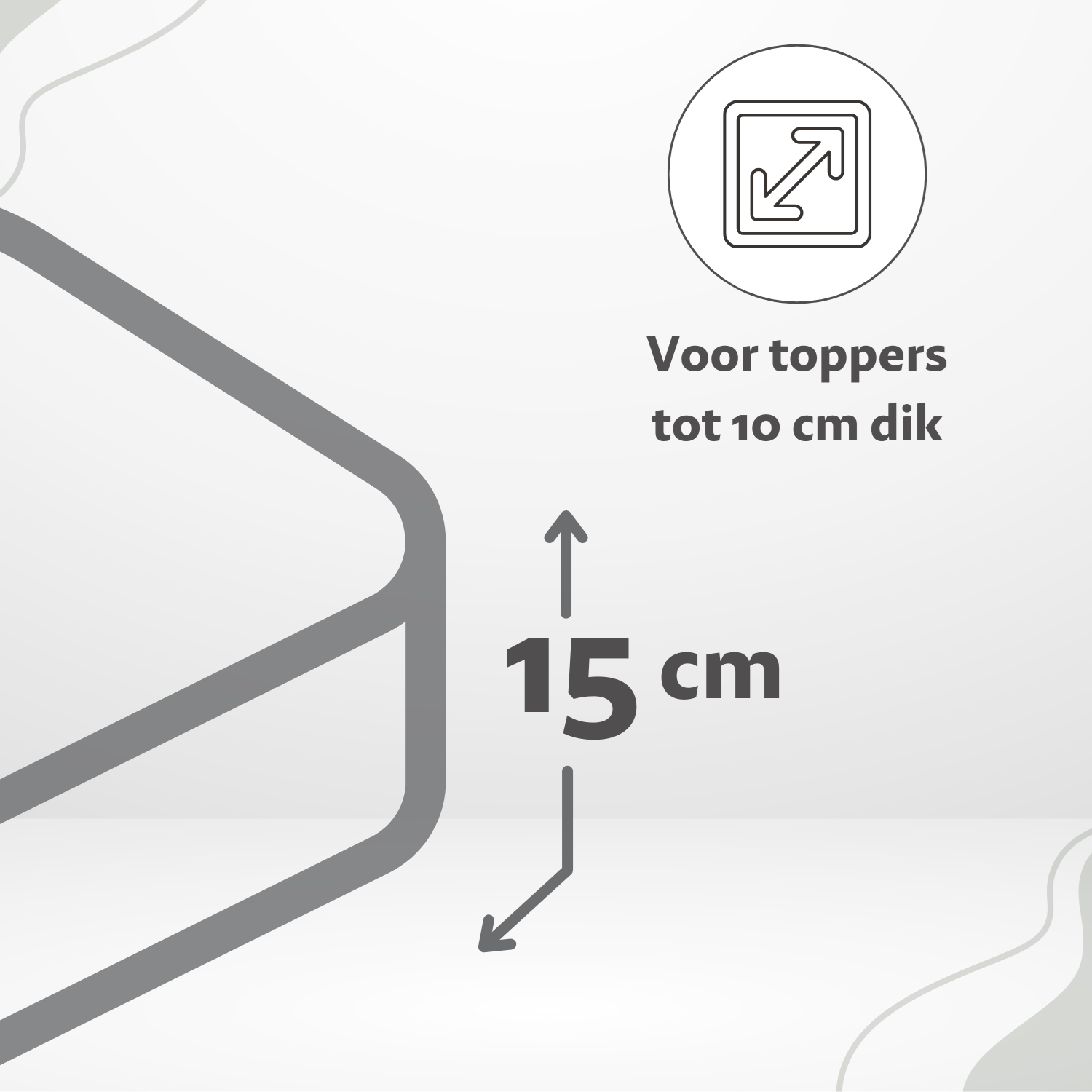 De katoensatijnen topper hoeslakens van Ten Cate zijn verkrijgbaar in de maten 90x200 cm, 140x200 cm, 160x200 cm en 180x200 cm waardoor ze geschikt zijn voor vrijwel alle matrasmaten. De hoeslakens beschikken over een hoekhoogte van 15 centimeter, hiermee zijn ze geschikt voor toppers en topdek matrassen tot 10 centimeter dik, de resterende 5 centimeter adviseren wij te gebruiken om onder uw topdekmatras te trekken. Hierdoor blijft uw hoeslaken nacht na nacht strak over uw matras liggen. Het elastiek rondom zorgt voor de perfecte pasvorm waardoor u uw hoeslaken niet dagelijks strak hoeft te trekken.